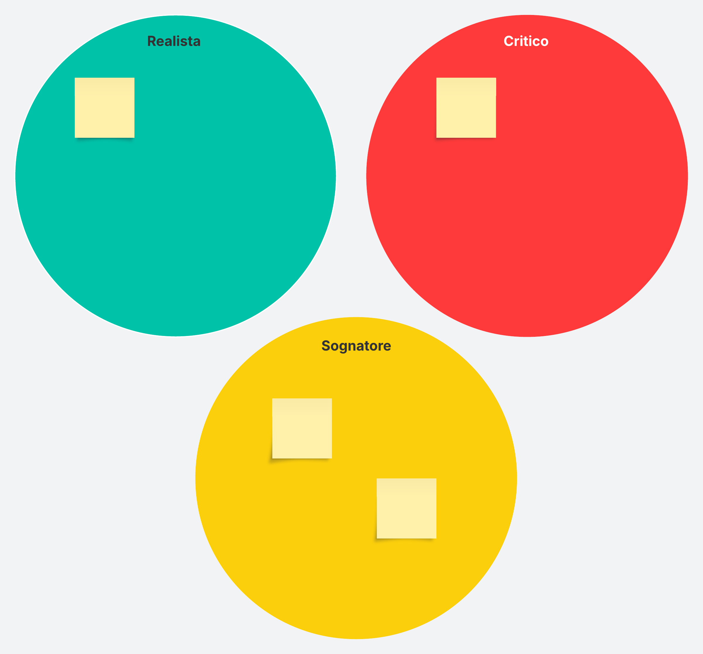 Prova questo modello basato sulla popolare strategia creativa di Disney. Partendo dal cerchio del sognatore, raccogli quante più idee possibili. Nessuna restrizione, nessuna critica. In seguito, applica un po' di realismo prendendo idee dal cerchio dei sognatori e evidenziando le opzioni più realizzabili. Infine, affronta le tue idee con la mentalità di un critico per valutare gli ostacoli o i punti deboli.