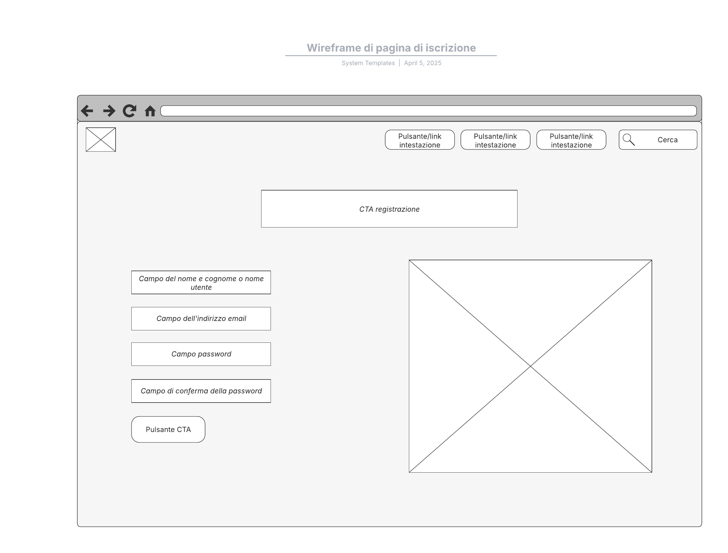 Apri questo modello per visualizzare un esempio dettagliato di un wireframe di base per pagina di registrazione, che puoi personalizzare in base al tuo caso d'uso.