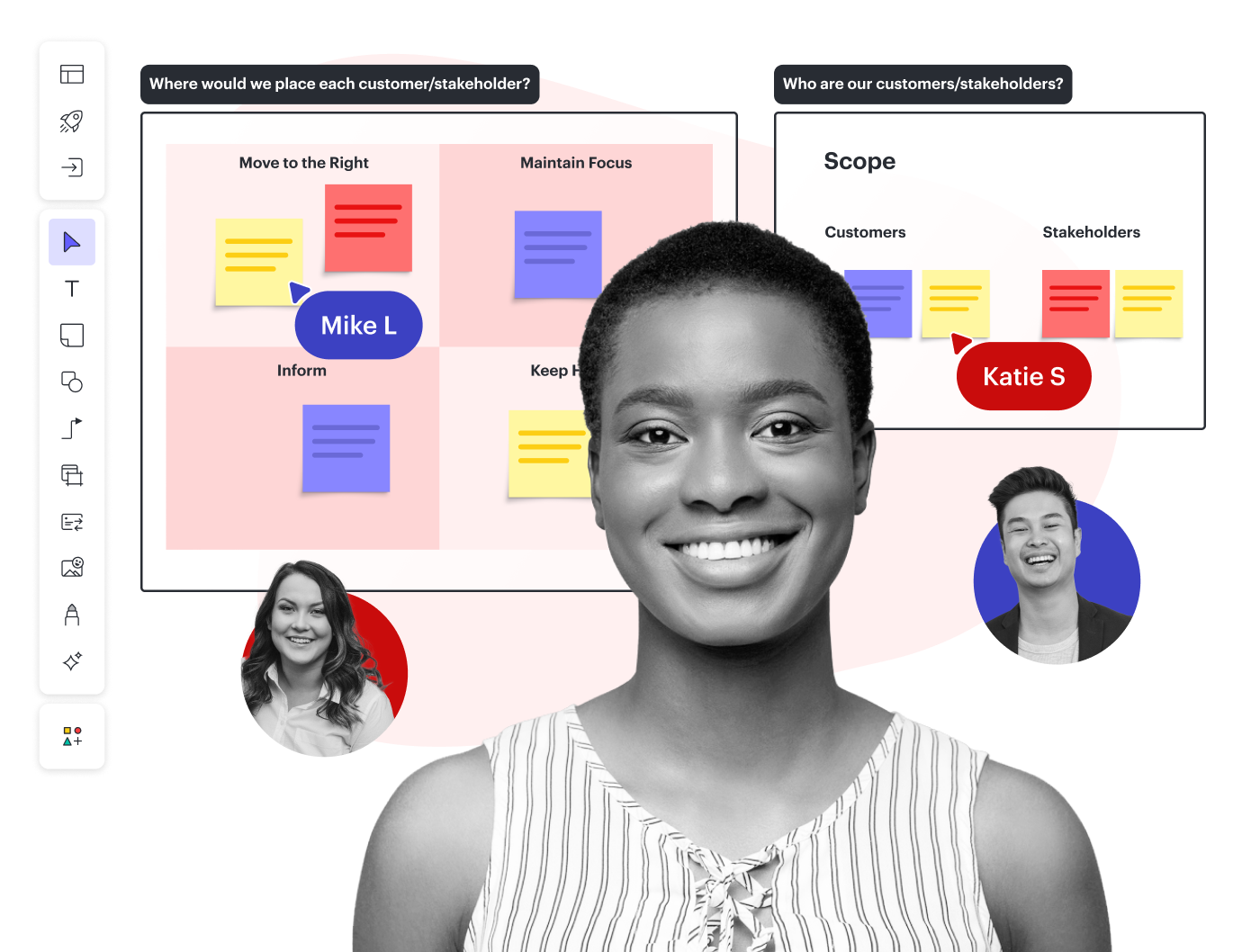 Lucidspark はステークホルダー分析のあらゆるニーズに対応します。ステークホルダーマップ テンプレートを使用して、あらゆるプロジェクトのステークホルダーを簡単に優先順位付けできます。どんなデバイスやオペレーティングシステムからでもチームとリアルタイムで共同作業を行い、コメントを残したり、チームメイトを@メンションしたり、製品内チャット機能を使用したりできます。