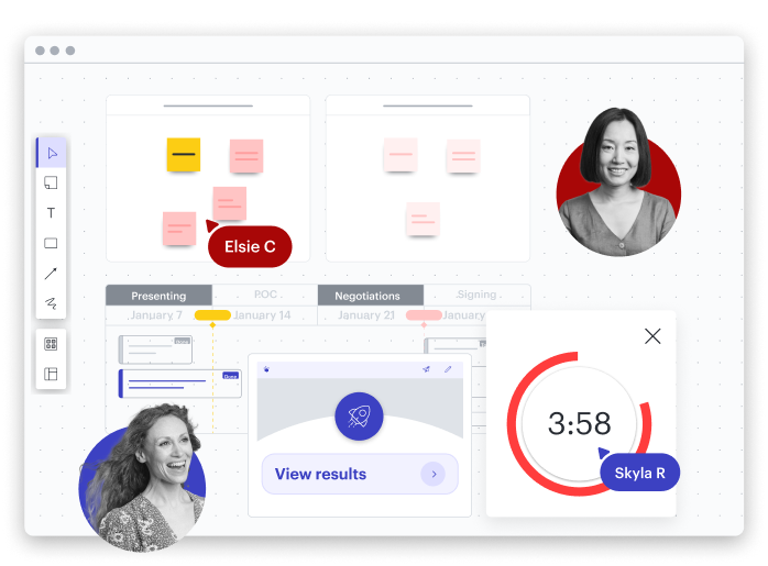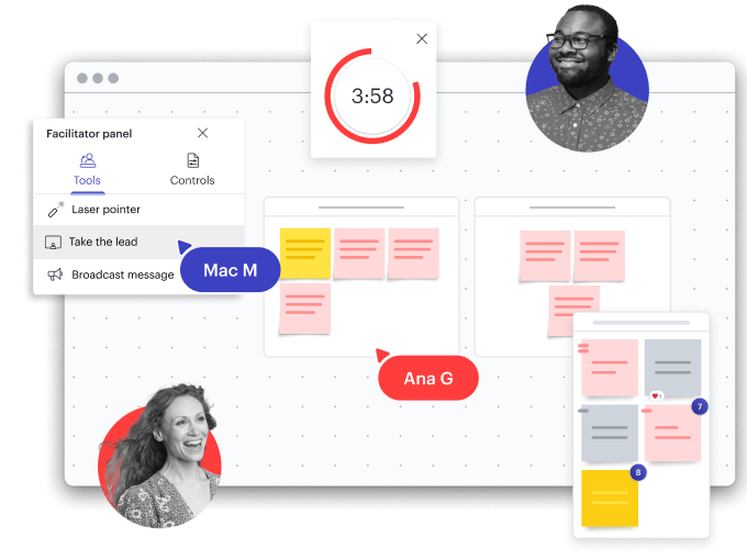 直感的な機能でステークホルダーマップを整理して評価。収集と並べ替え機能でブレインストーミングセッションのアイデアをグループ化し、付箋にタグ付けして優先順位を確認し、洞察を明らかにします。タイマー機能で会議を計画通りに進められます。