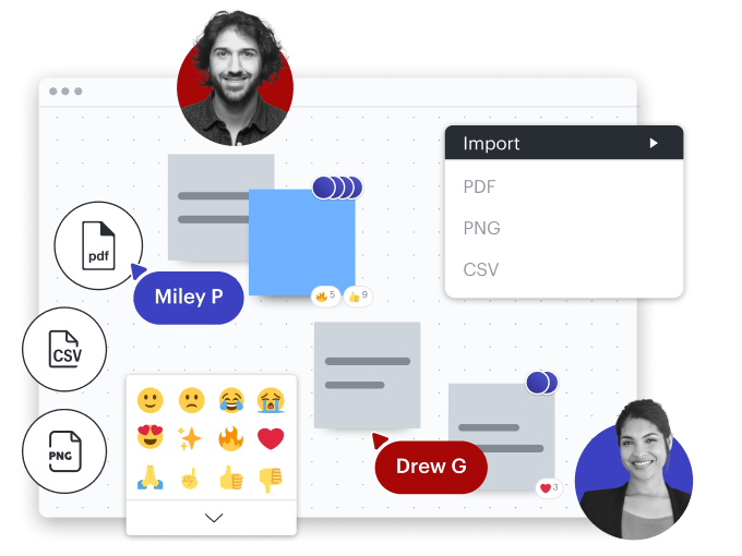ステークホルダーマップを Miro などのオンラインホワイトボードから Lucidspark に移動すれば、作業を中断したところから再開が可能。PDF、PNG、CSV のインポートも可能です。