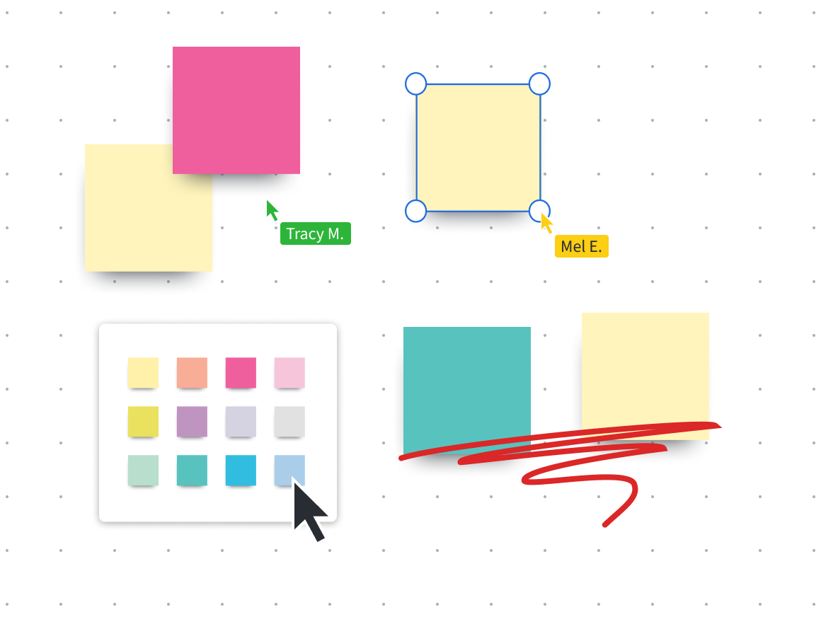 直感的に使えるホワイトボードで、コラボレーションもスムーズ。リアルタイムでチームと共同作業し、フィードバックを交換し、アイデアを発展させ、コメントを残したり、チャットに参加したり、お気に入りの絵文字で返信するのも自在です。人数無制限で共同編集者を招待でき、可能性が無限に広がります。