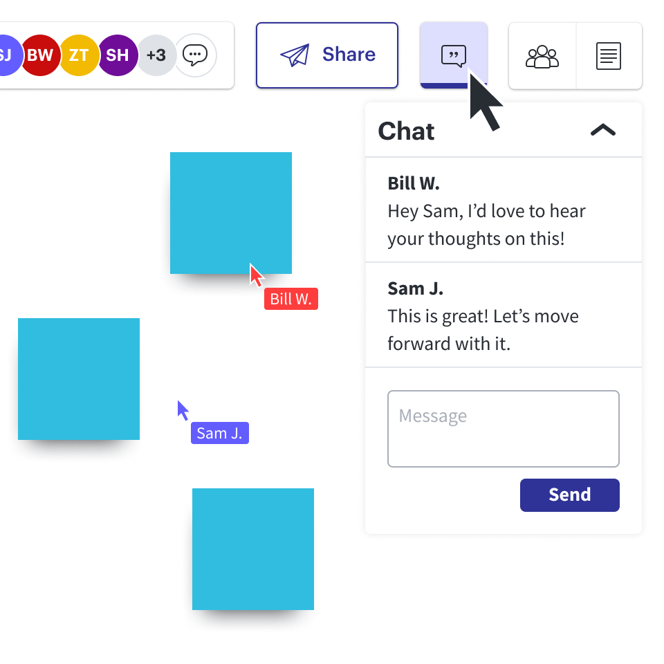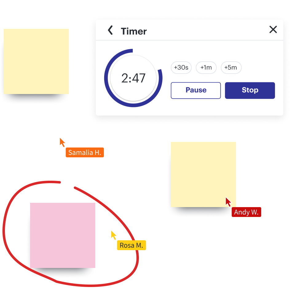 自由にアイデアを出し合い、それぞれの創造性を築き、フィードバックを共有するのに必要なあらゆる機能が詰まったビジュアルミーティングスペース。組み込みのタイマー、投票機能、便利なテンプレートやフリーハンド描画ツールなど、プロジェクトの前進に役立つツールが揃い、リモートワークのチームにも最適です。