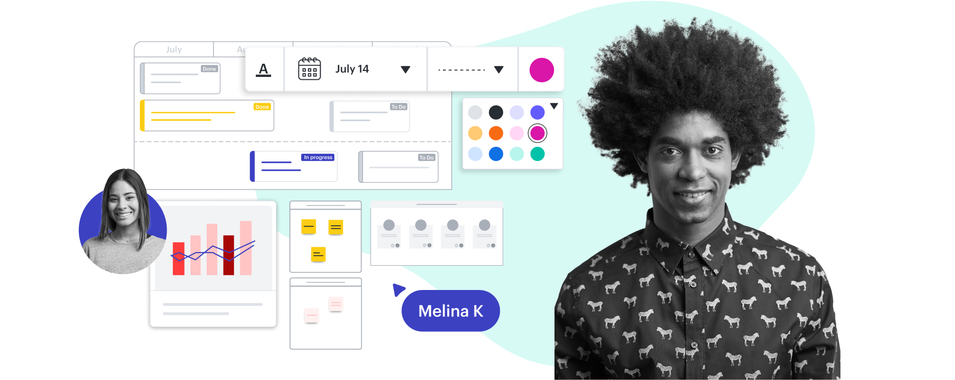 各共同編集者に色を割り当て、[作者を表示] オプションを使用して各付箋を追加・編集したユーザーを確認。