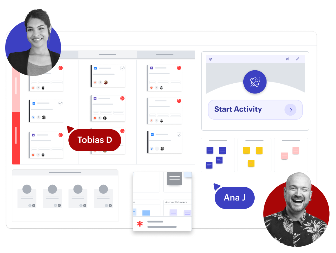 アイスブレイクやビジュアルアクティビティで参加率を高めます。プライベート参加モードとブレイクアウトボードを使えば、物静かなチームメンバーの発言や異なる発想も引き出しやすくなります。