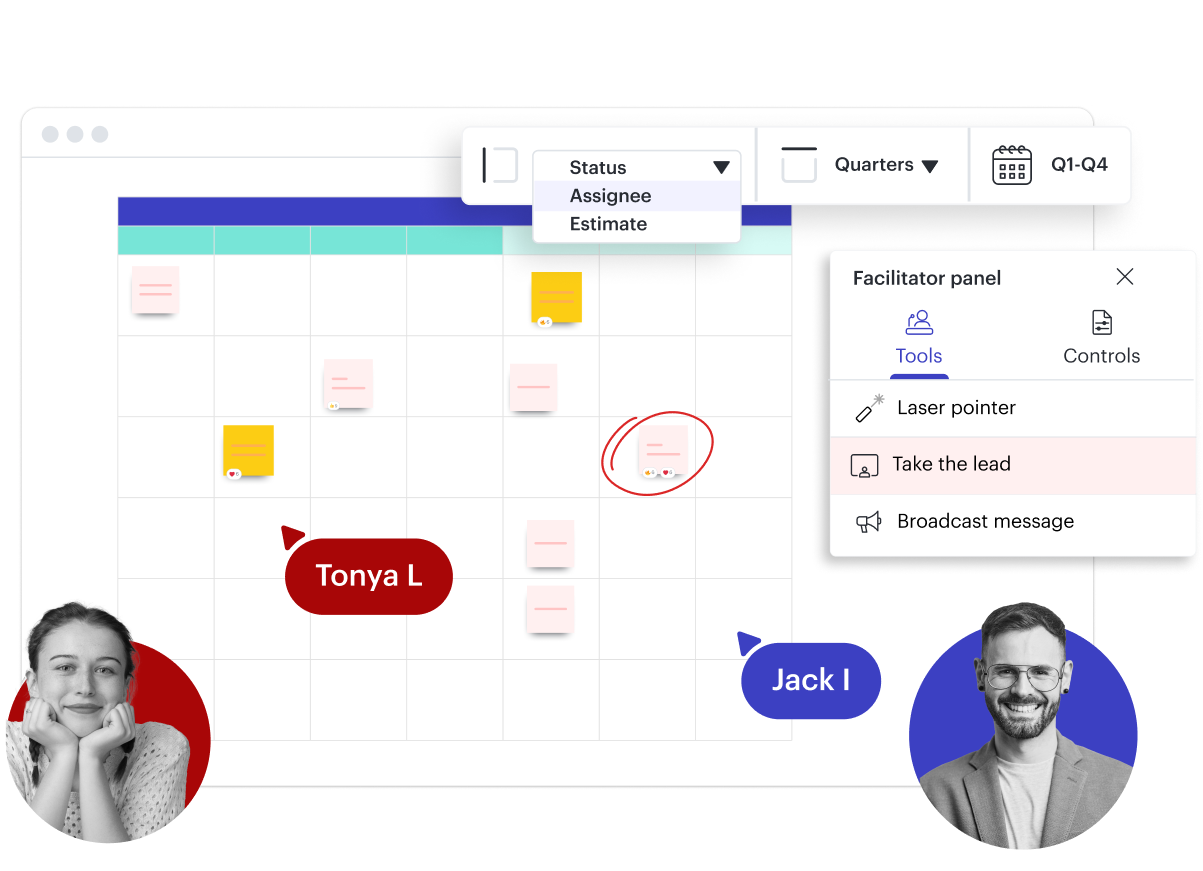レーザーポインターを使い、参加者が最も重要な情報に集中できるようにします。参加者がアイデアを整理し、分類し、優先順位をつけるのに役立つテンプレートやアクティビティを用意しておきます。