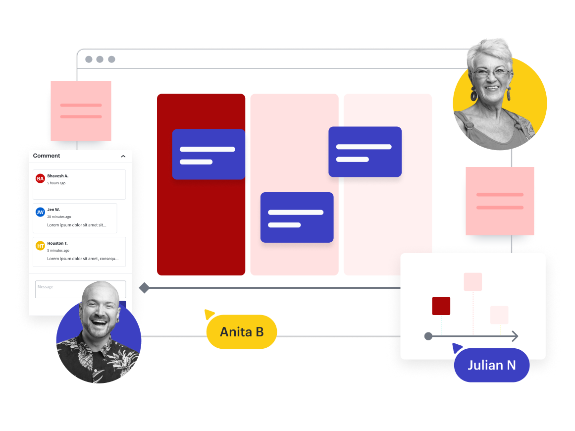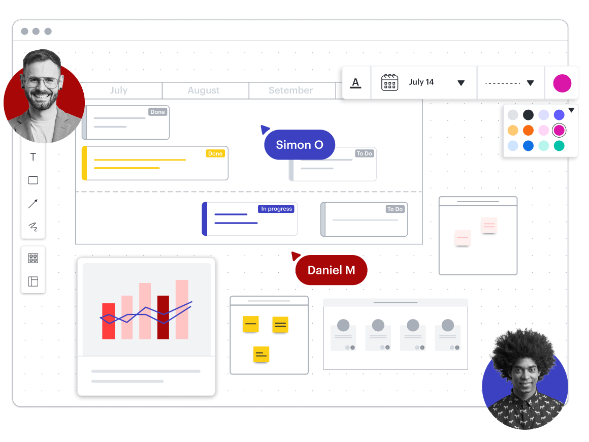 プロジェクトを迅速に進行。Lucidspark を使えば、関係者の調整を図り、ワークフローを明確にし、プロセスと意思決定の合理化につながる分かりやすく創造的な計画セッションを実現できます。
