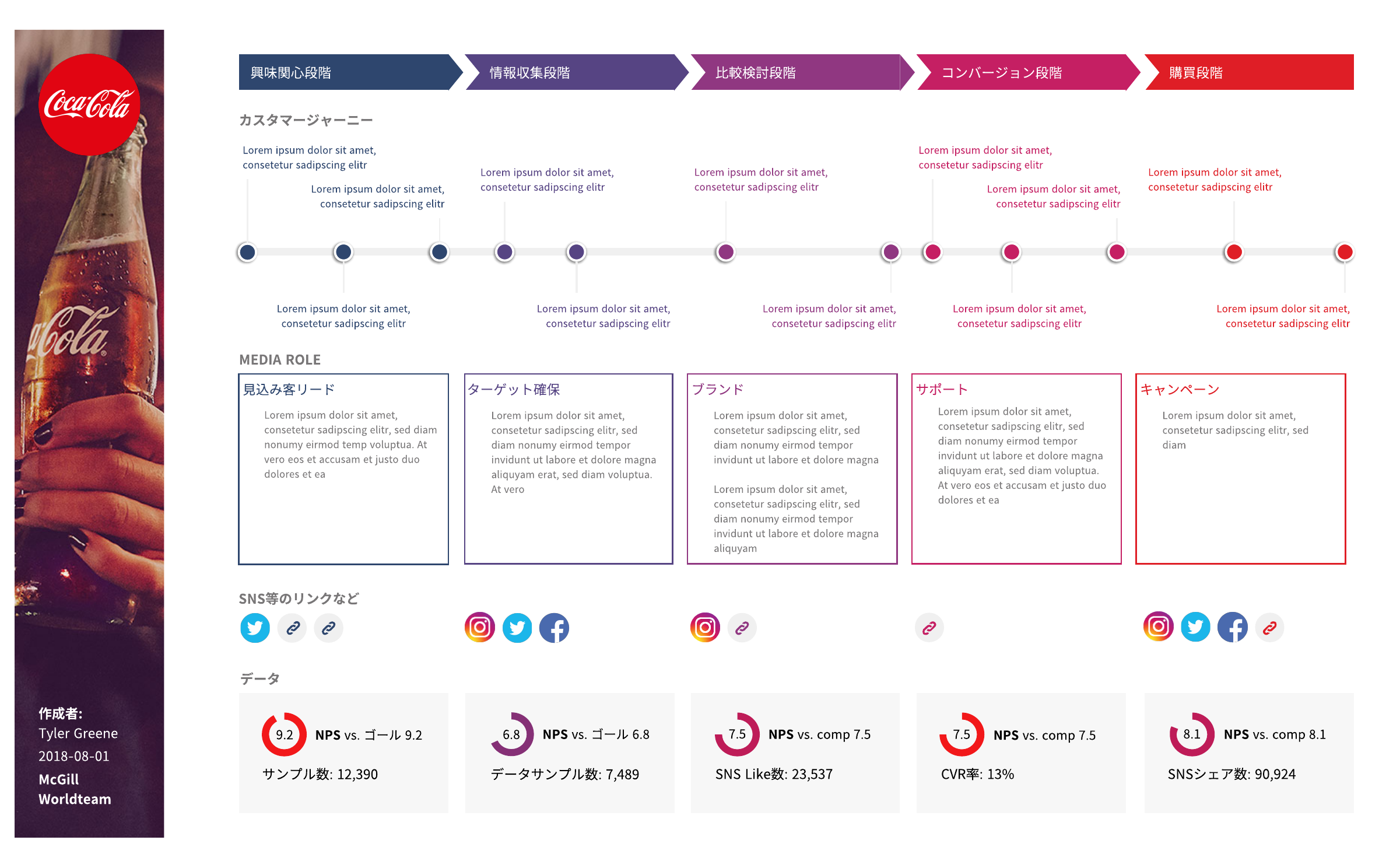 このカスタマージャーニーマップを活用して、顧客やユーザーのユーザーデータや調査をベースに、予定される行動やアクションプランを作成していきましょう。