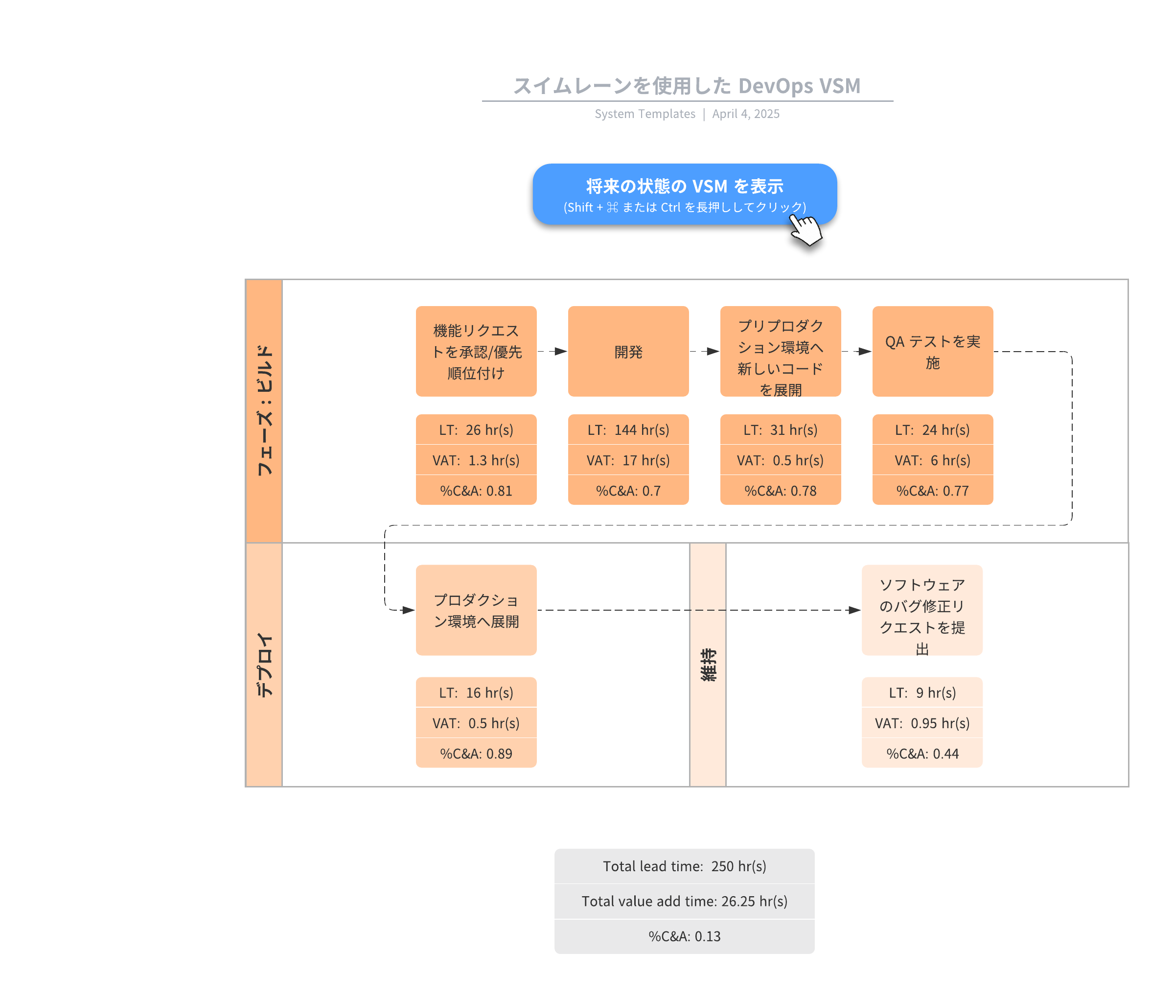 このテンプレートを開き、ユースケースに合わせてカスタマイズ可能なスイムレーン DevOps VSM の例を詳しく確認してみましょう。