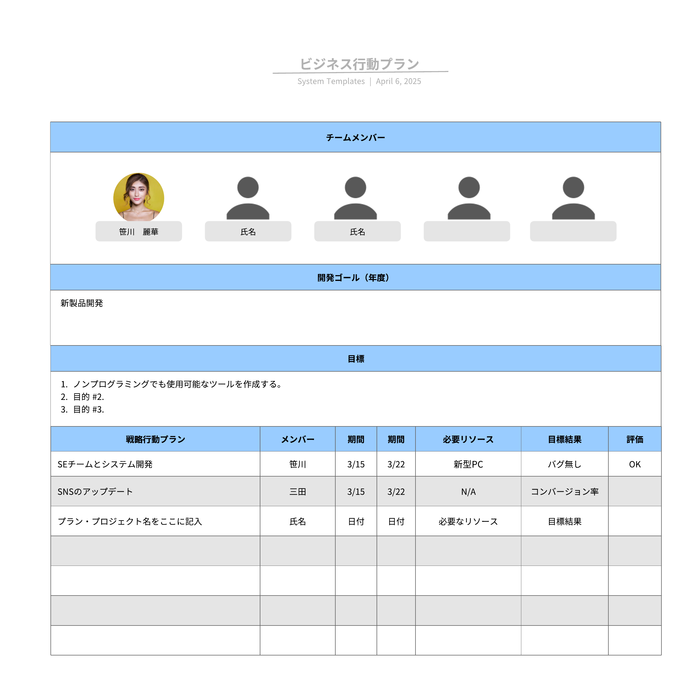 このビジネス行動プランのテンプレートを利用して、今年度のゴールに向けてのチームプランを組み立てましょう。