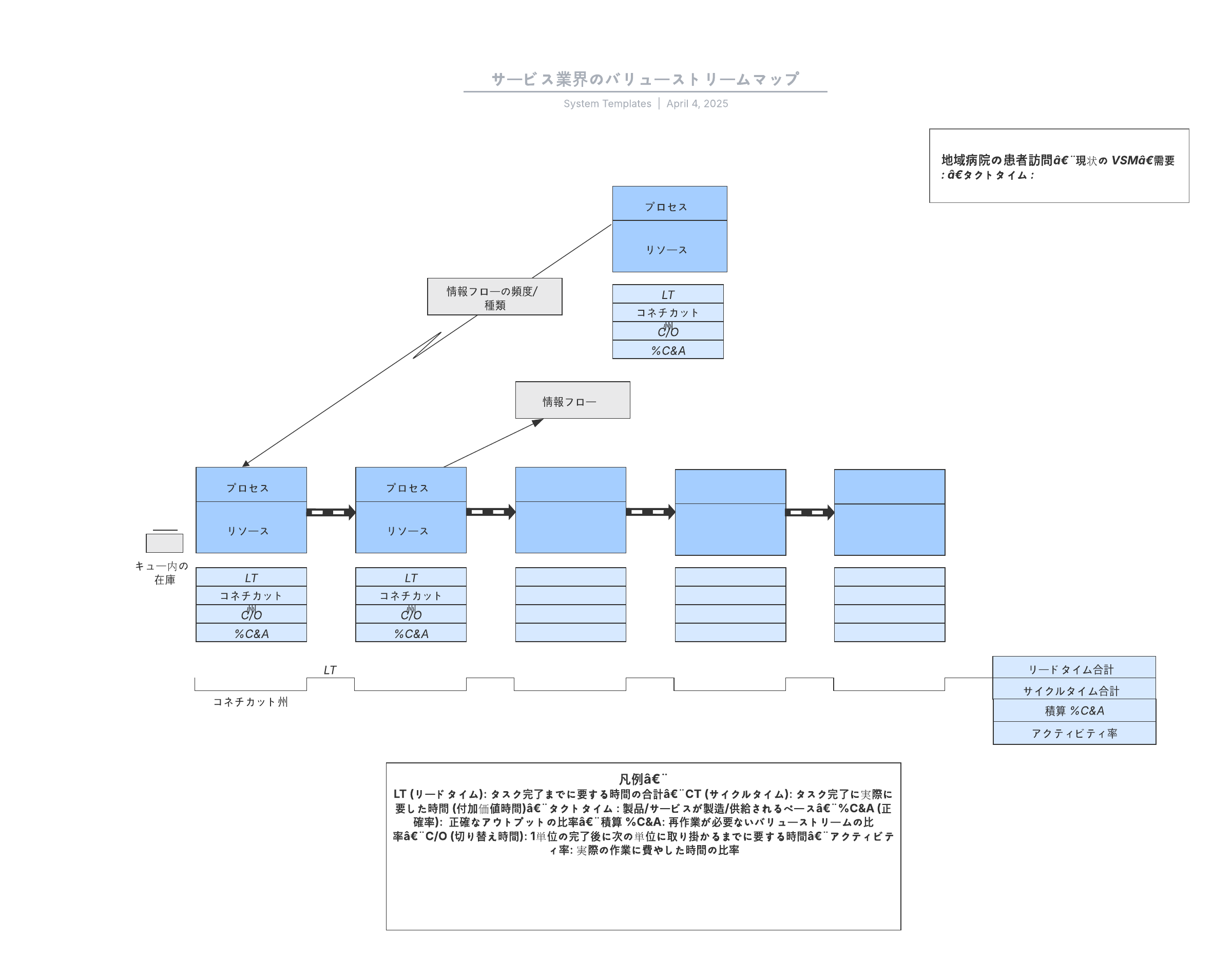 ユースケースに合わせてバリューストリームマップ (サービス業界) をカスタマイズするには、このテンプレートを開き、コンテンツを追加します。
