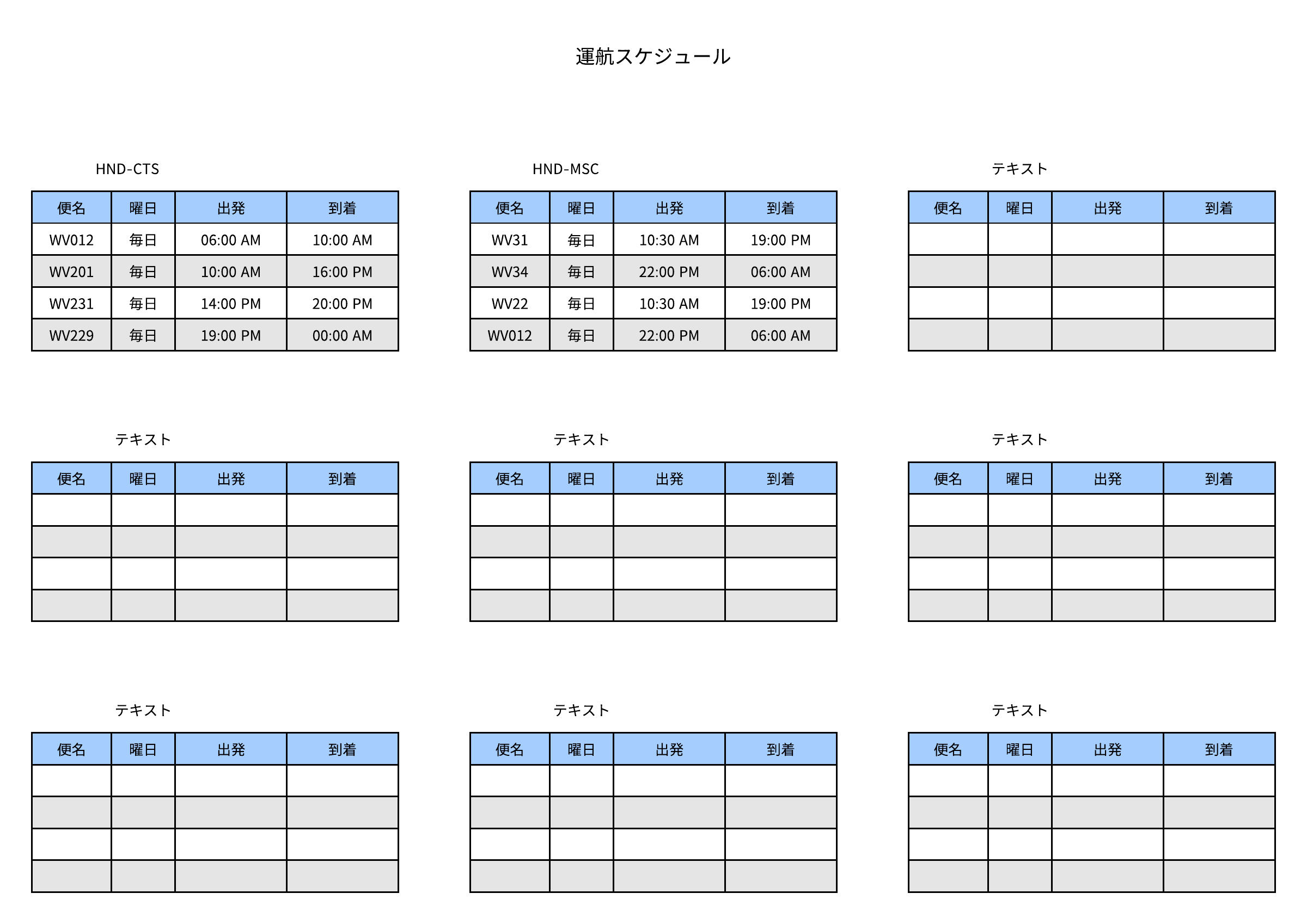 この運行スケジュール表 を利用して、飛行機やフェリーなどのスケジュールを作成していきましょう。