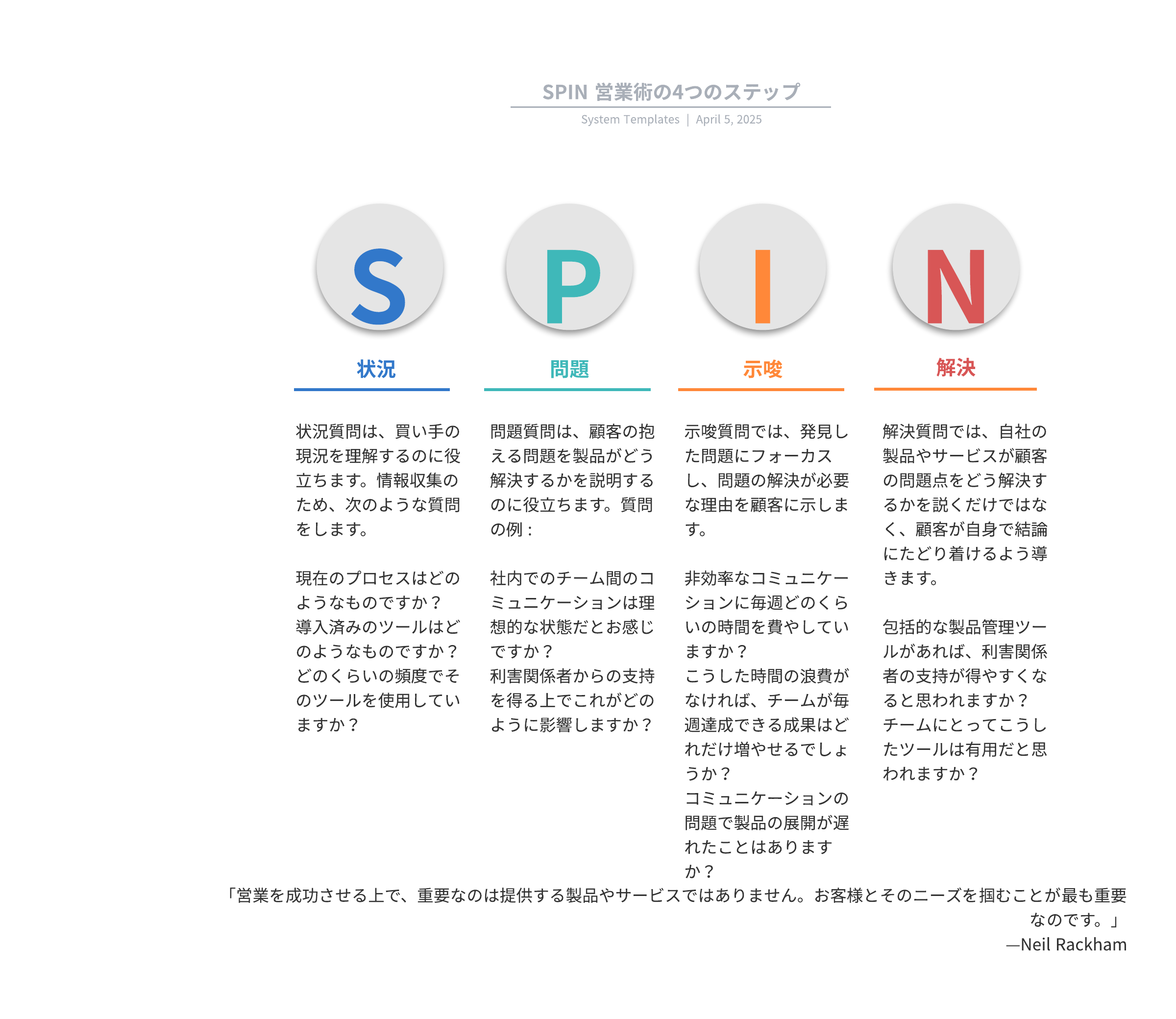 テンプレートを開き、ユースケースに合わせてカスタマイズ可能な SPIN 営業術の4つのステップテンプレートを詳しく確認してみましょう。