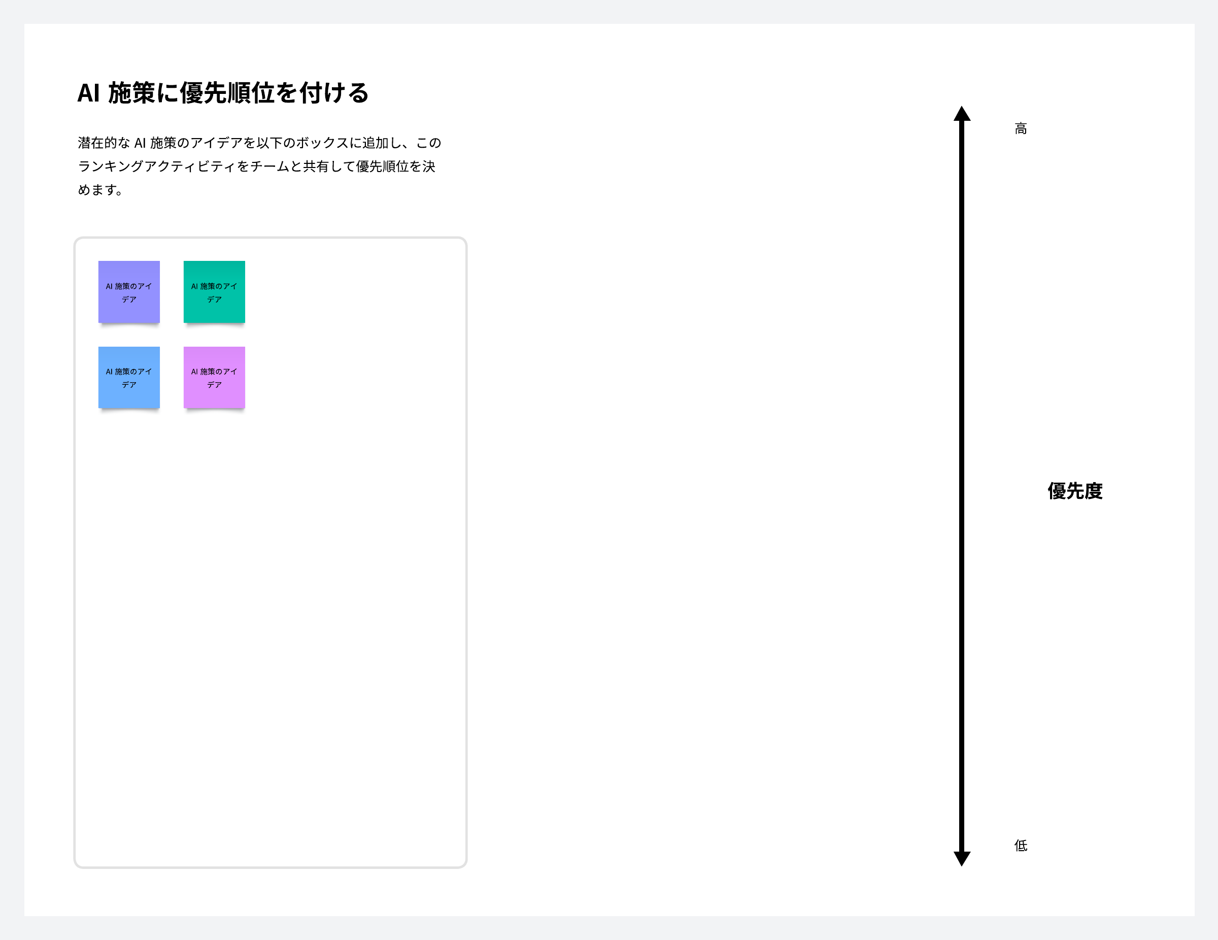 AIイニシアチブのアイデアを、優先順位の高いものから低いものへランク付けしましょう。