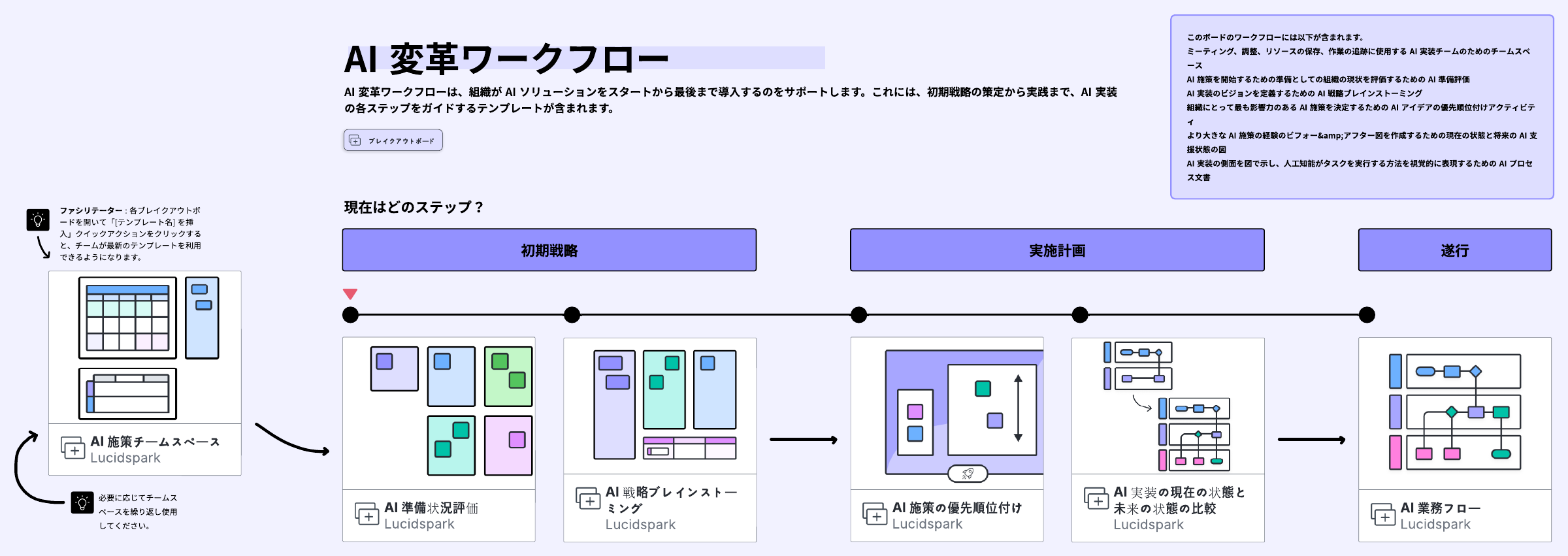 初期戦略から実行まで、ワークフロー全体を通じて AI 施策を実行します。
