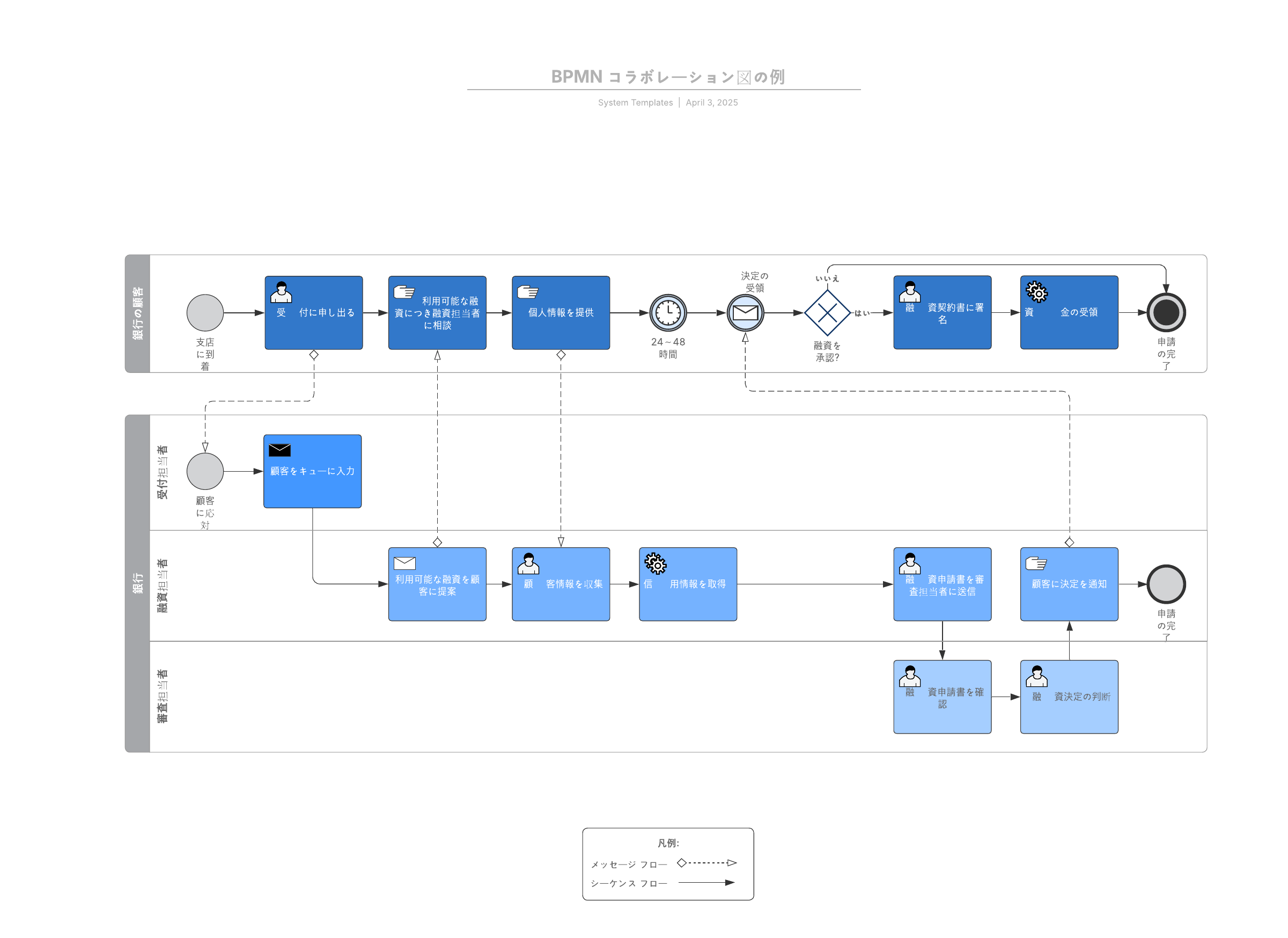 このコラボレーション図では、ビジネスプロセスモデリング表記法 (BPMN) を用いて、複数のエンティティ間でのビジネスプロセスやコミュニケーションを示しています。このテンプレートでは、融資申請のプロセスを図式化しています。