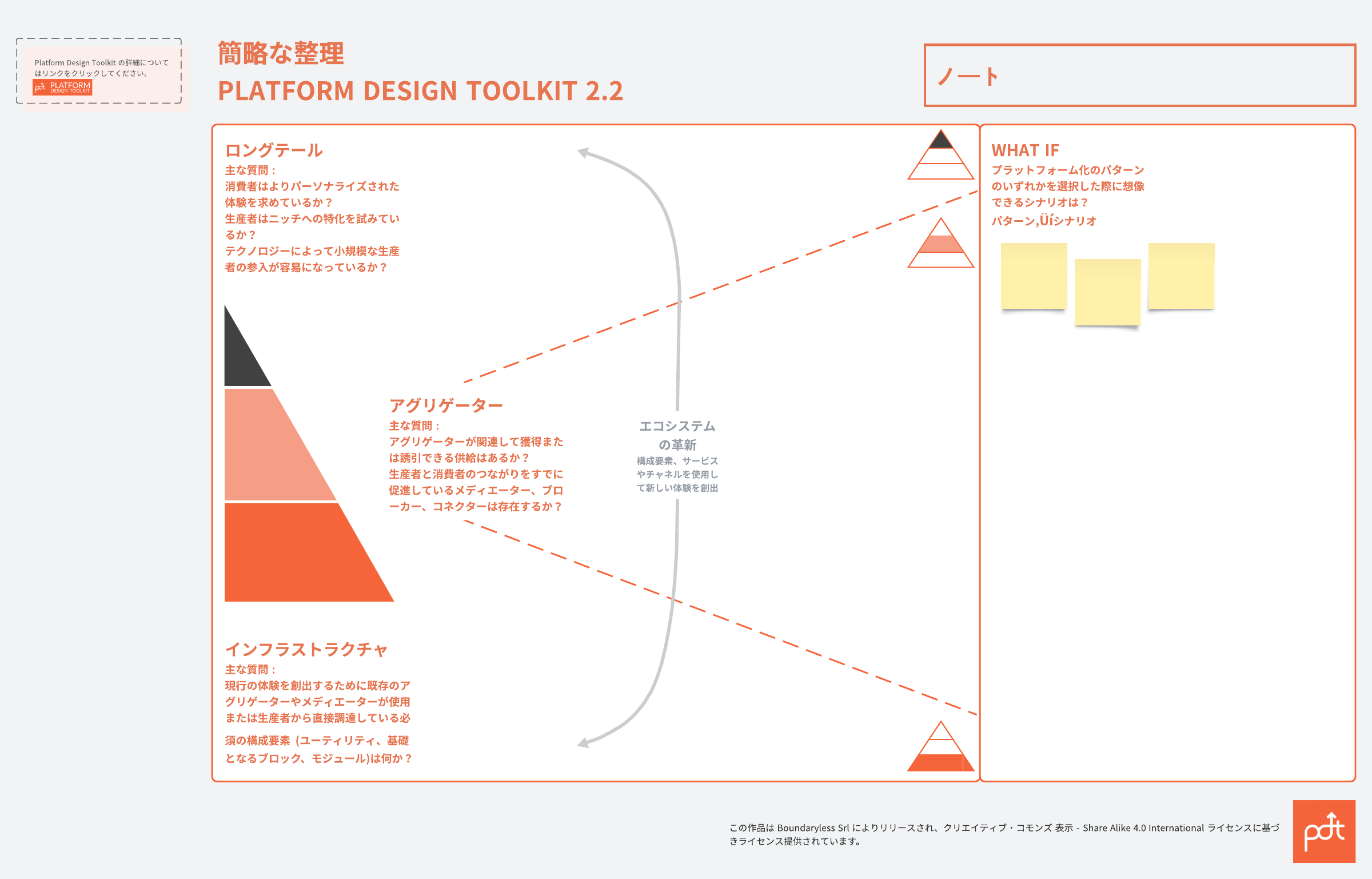プラットフォーム化のパターン (ロングテール、アグリゲーション、インフラストラクチャ) のアプリケーションを使って「WHAT IF」シナリオを手軽に探索できる簡略な整理テンプレートです。