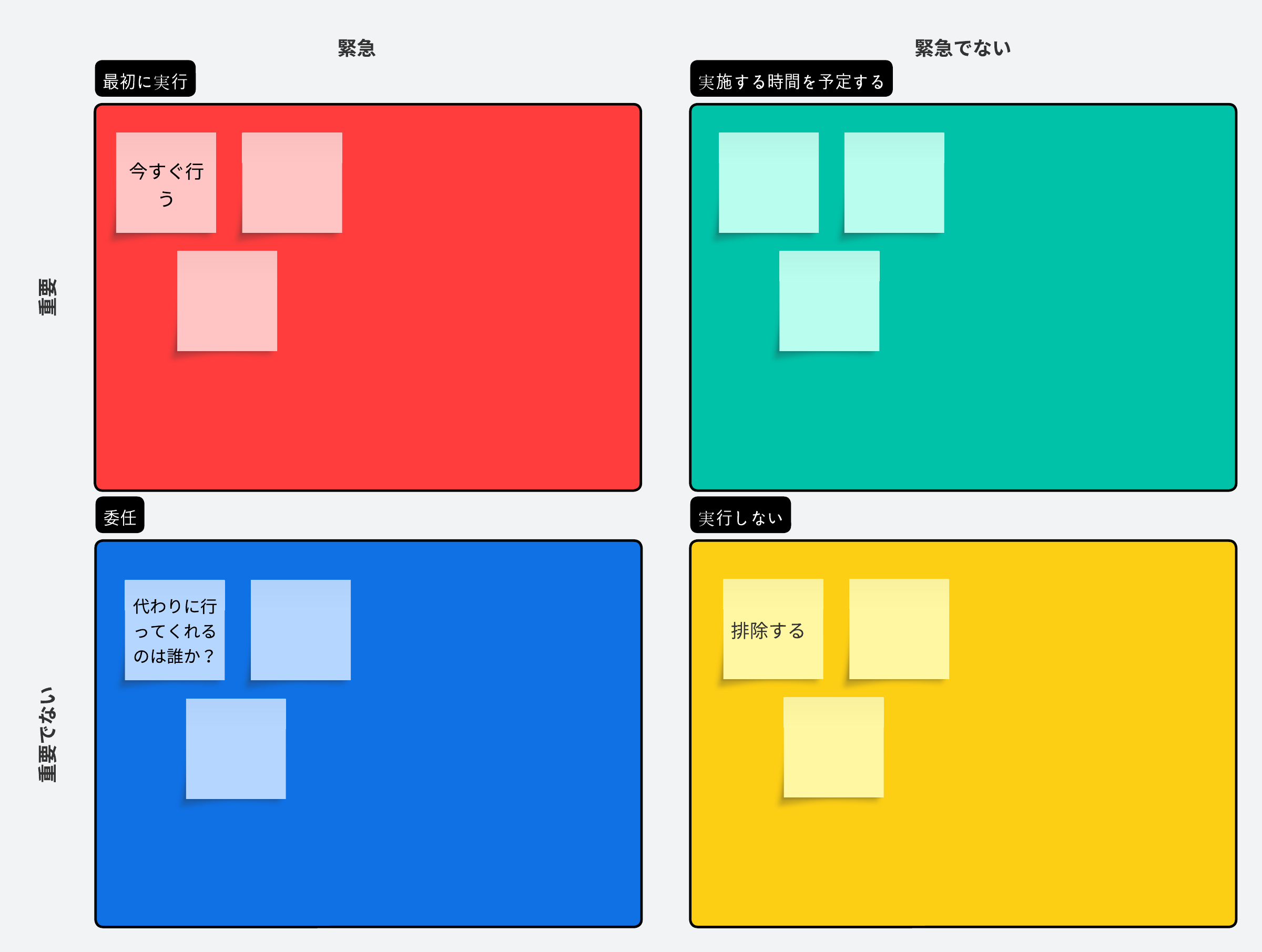 最初に行うこと : 最も重要で緊急のタスク、明確な期限があるタスクを「最初に行う」象限に配置します。