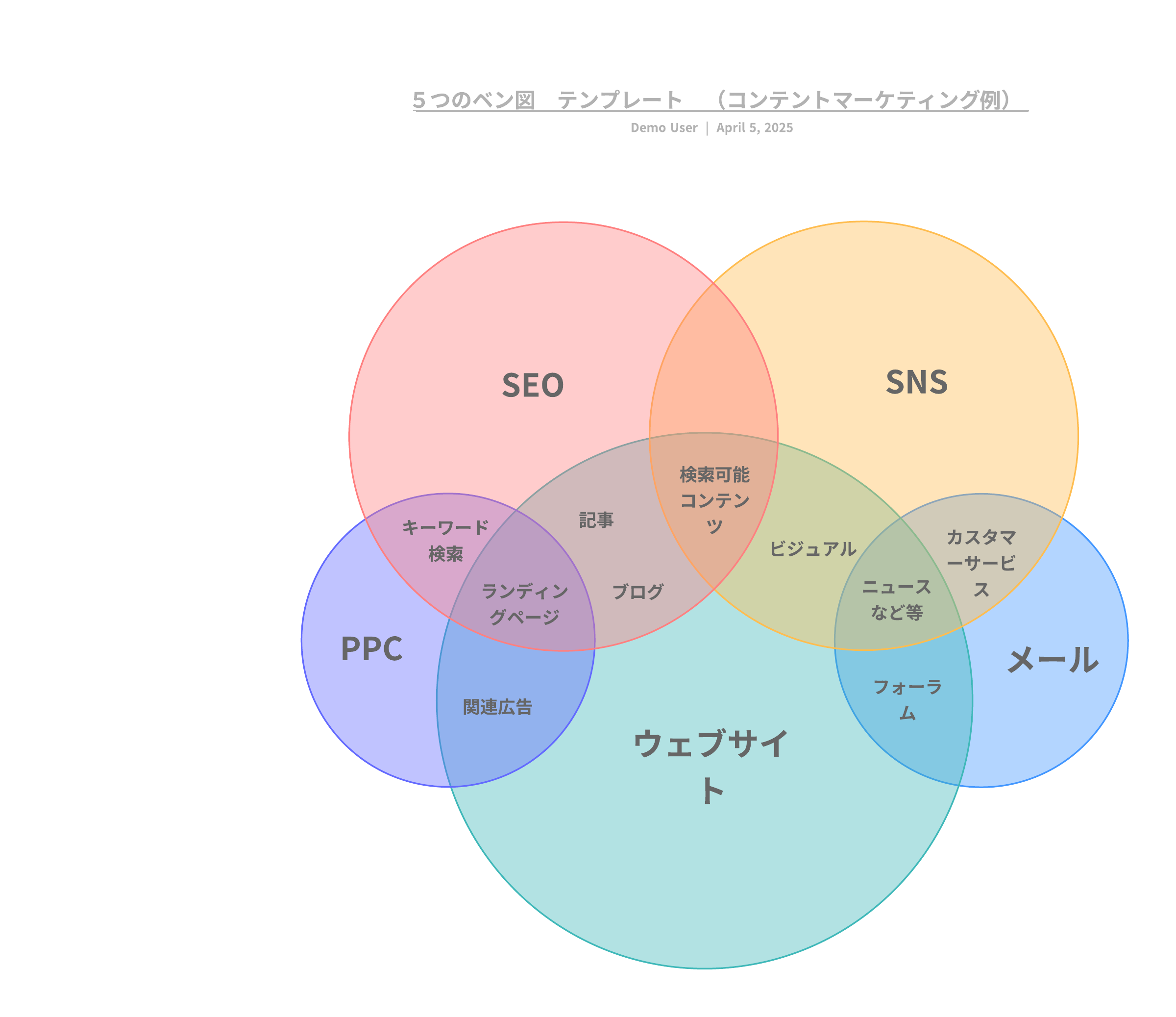 この5セットのベン図テンプレートを利用し、異なるなカテゴリ又は、コンセプト等の種類性と相違点を視覚的に示します。