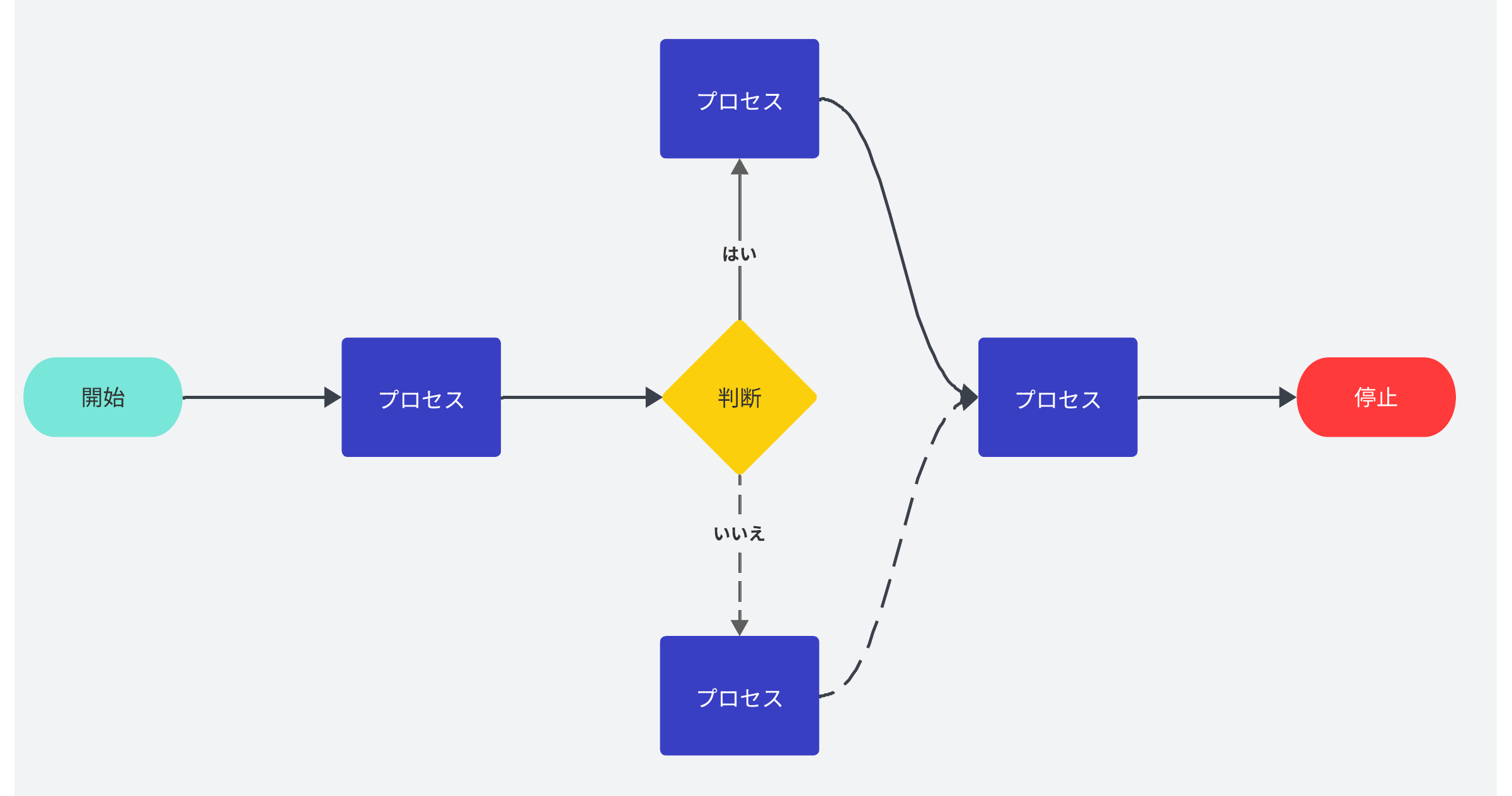 フローチャートは、プロセスやワークフローにより複雑さが異なりますが、ほとんどのフローチャートでは、いくつかの基本的な図形と記号でプロセスのさまざまな部分を表しています。