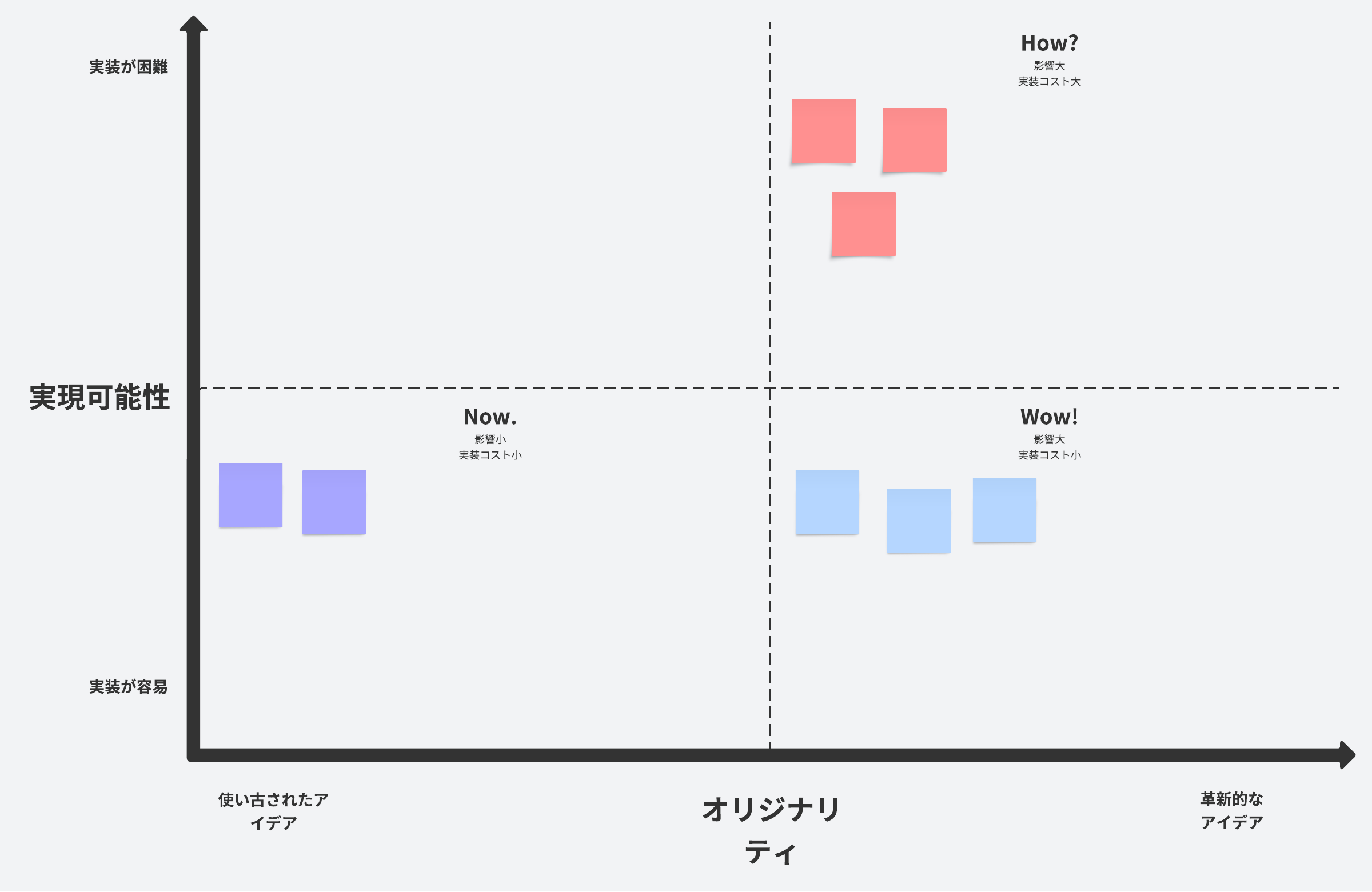 オリジナリティと実現可能性に基づきアイデアを検討するのに役立つ How-Now-Wow マトリックスです。マトリックス上にアイデアを配置して、革新的でスピーディに実装できるものを見つけましょう。