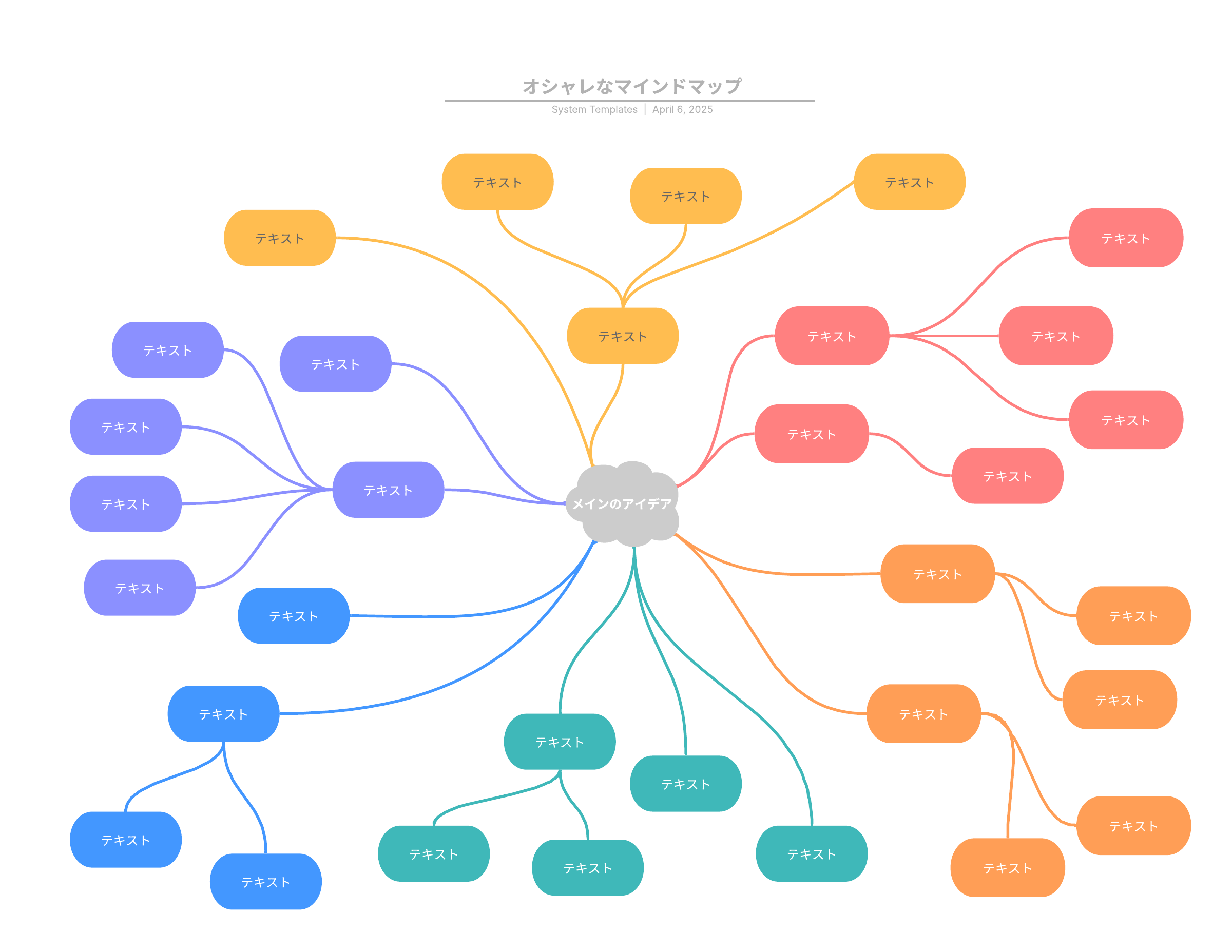 このテンプレートをカスタムするには、センターにある図形にメインのアイディアを入力し、アイディアをどんどん追加します。