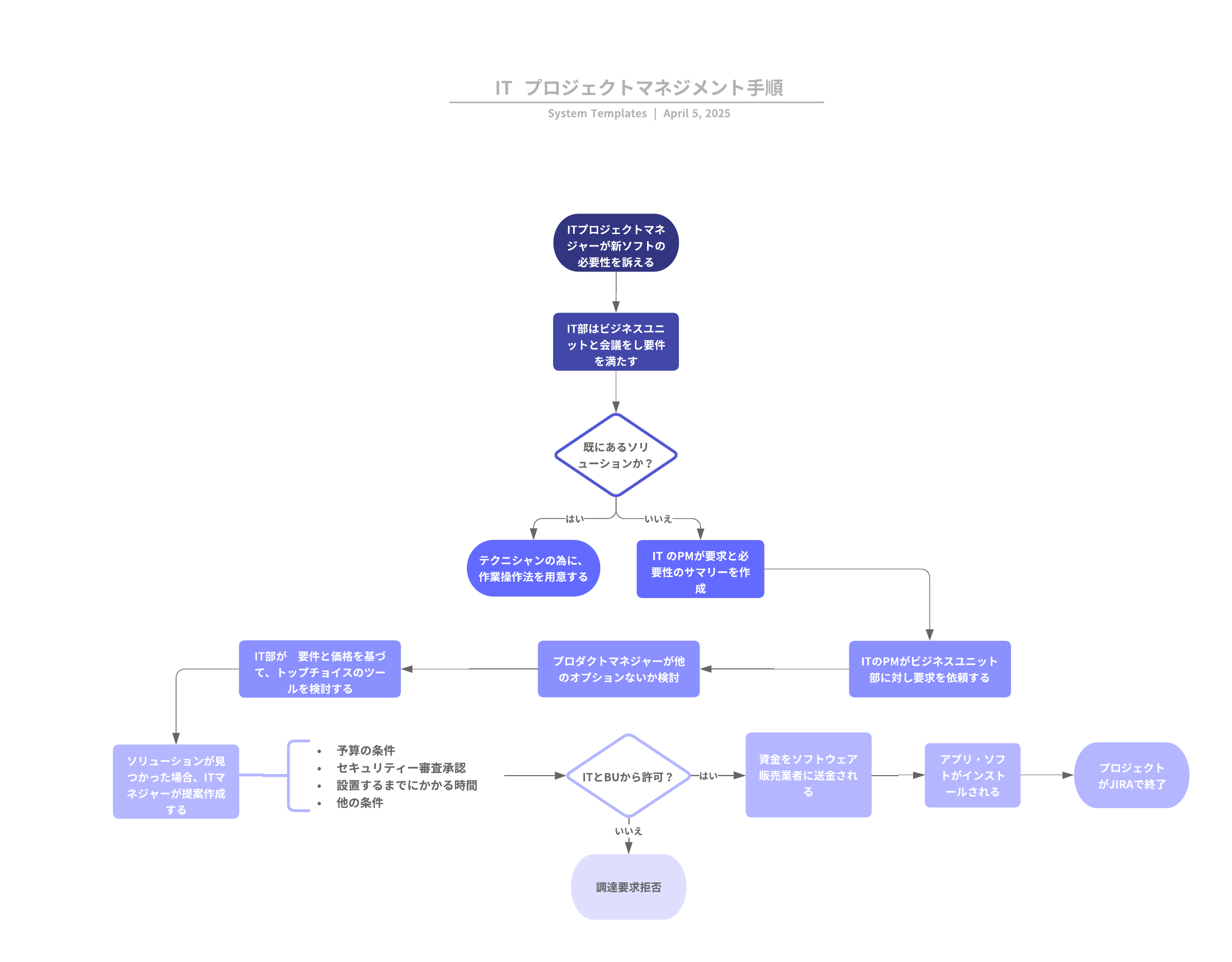 この例は主にプロジェクト管理で使用されています。見ての通り、特定の結果に達成するまでの道のりを、ビジュアル化した図です。