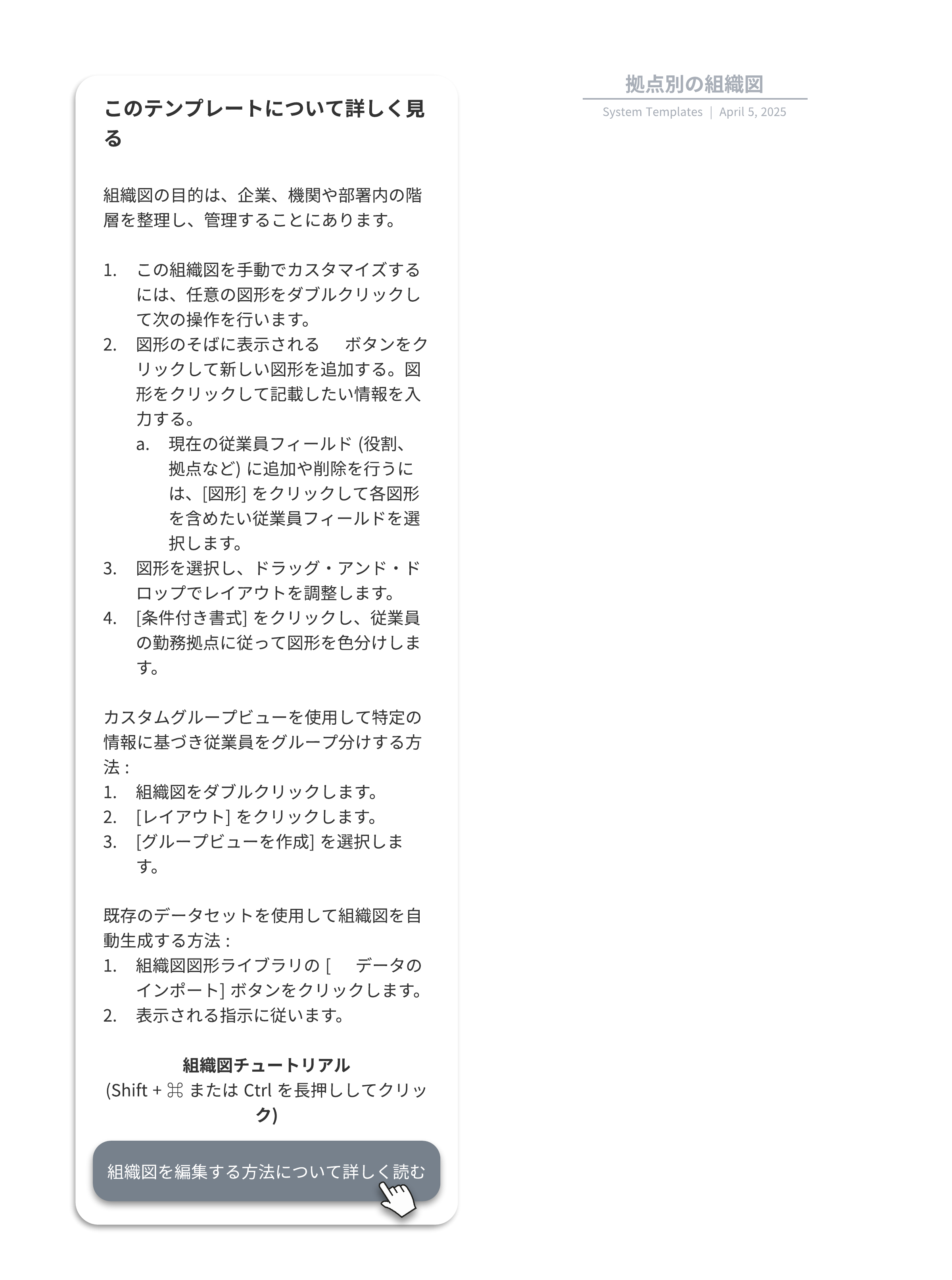 ユースケースに合わせて拠点別の組織図をカスタマイズするには、このテンプレートを開き、コンテンツを追加します。