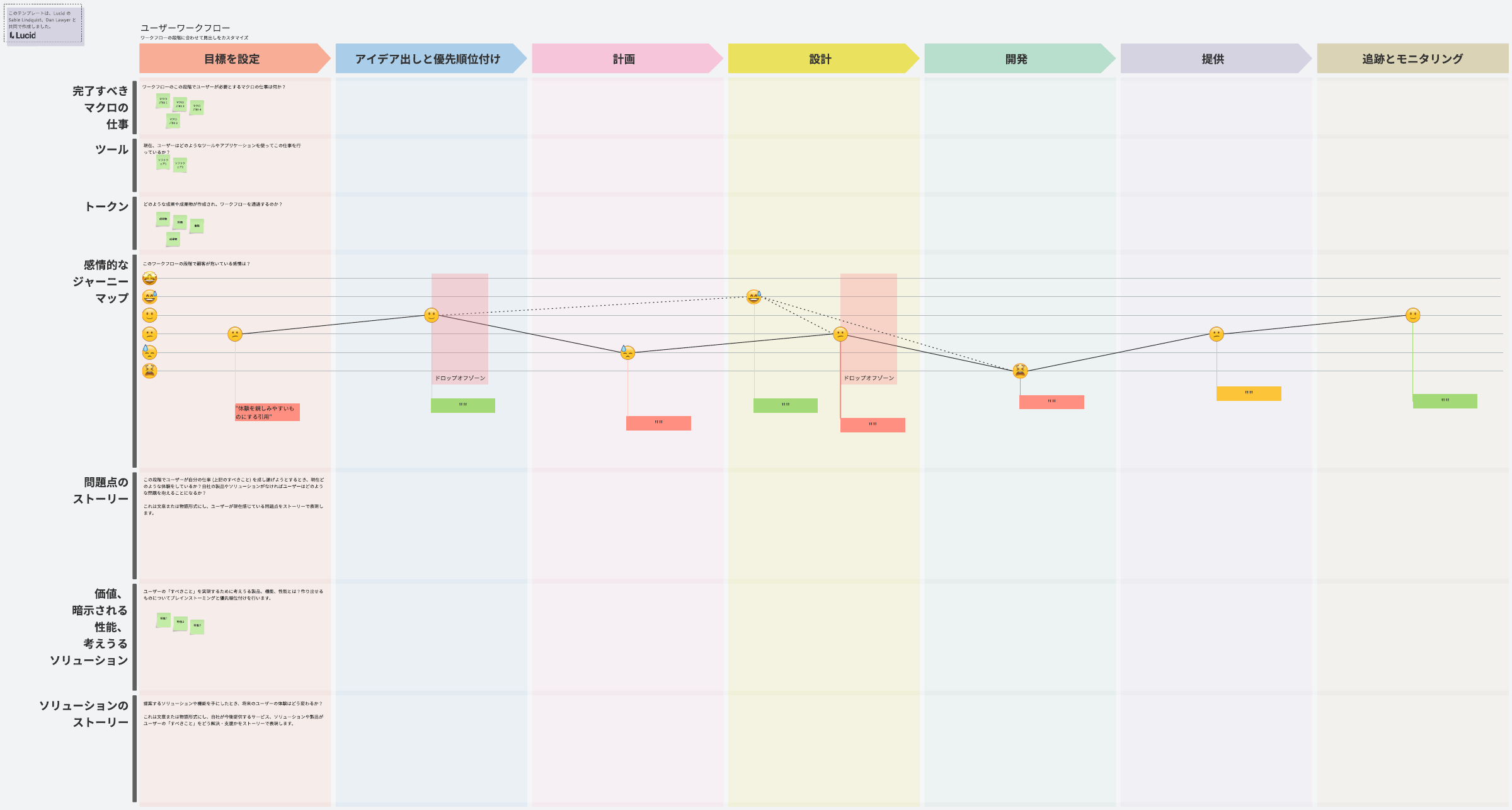 Lucid では、製品戦略のフレームワーク「製品の基礎」を製品・戦略関連の課題発見に使用しています。ユーザーの立場に立ち、そのニーズ、ギャップや問題点を特定して、考えうる製品の新機能やソリューションについてアイデア出しやブレインストーミングを行います。