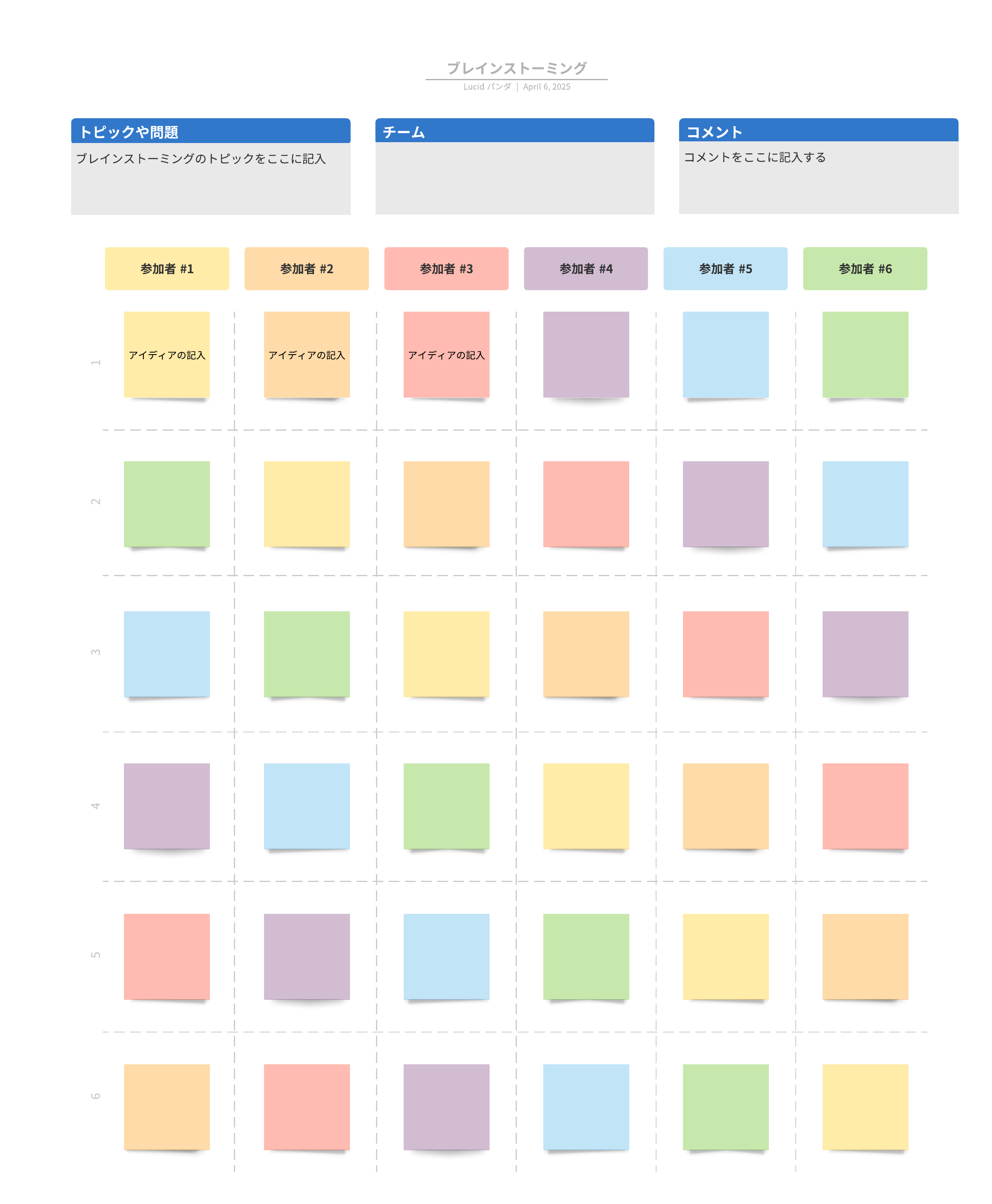 このテンプレートを使ってビジネスのアイディア、情報や会議の内容等をブレストしましょう。
