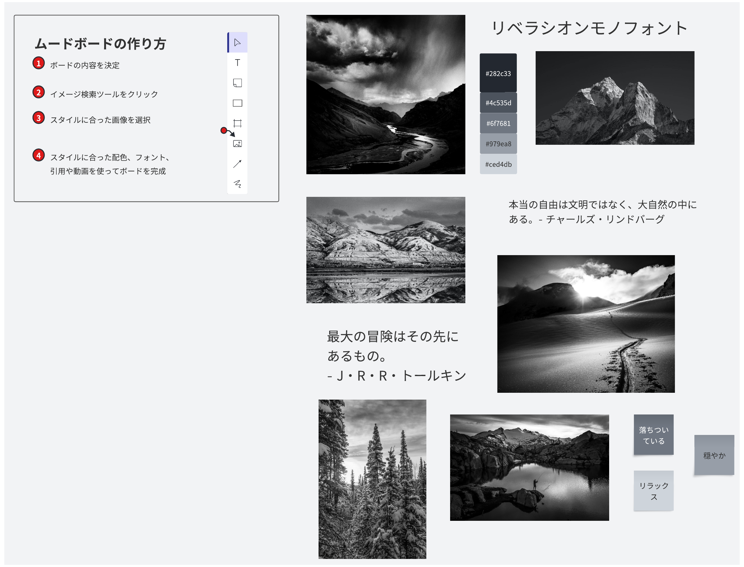 次のプロジェクトに向けたムードのブレインストーミングと発見に役立つこのムードボードの例です。ムードボードのデザインや作り方が分からなくてもこのテンプレート例を使えば簡単に実践できます。