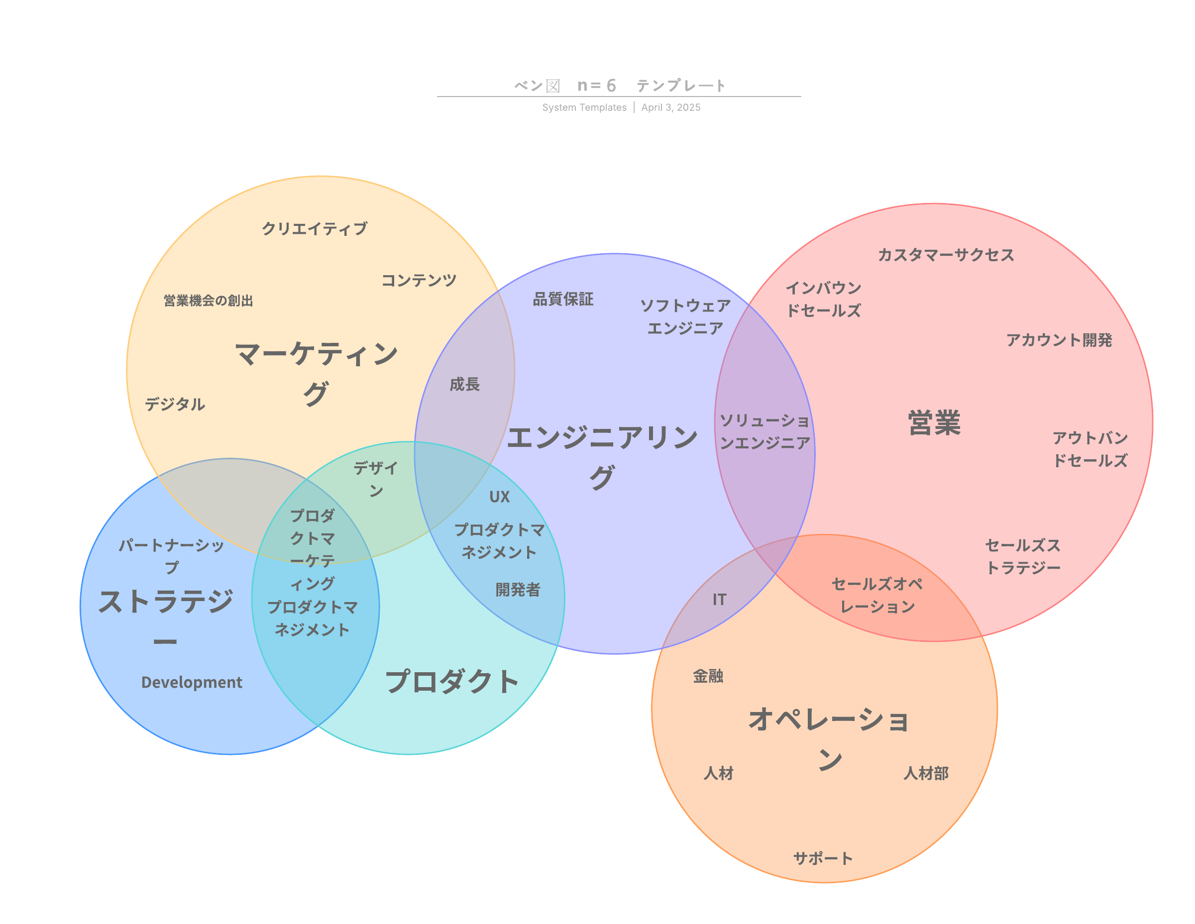 この6セットのベン図テンプレートを利用し、異なるなカテゴリ又は、コンセプト等の種類性と相違点を視覚的に示します。
