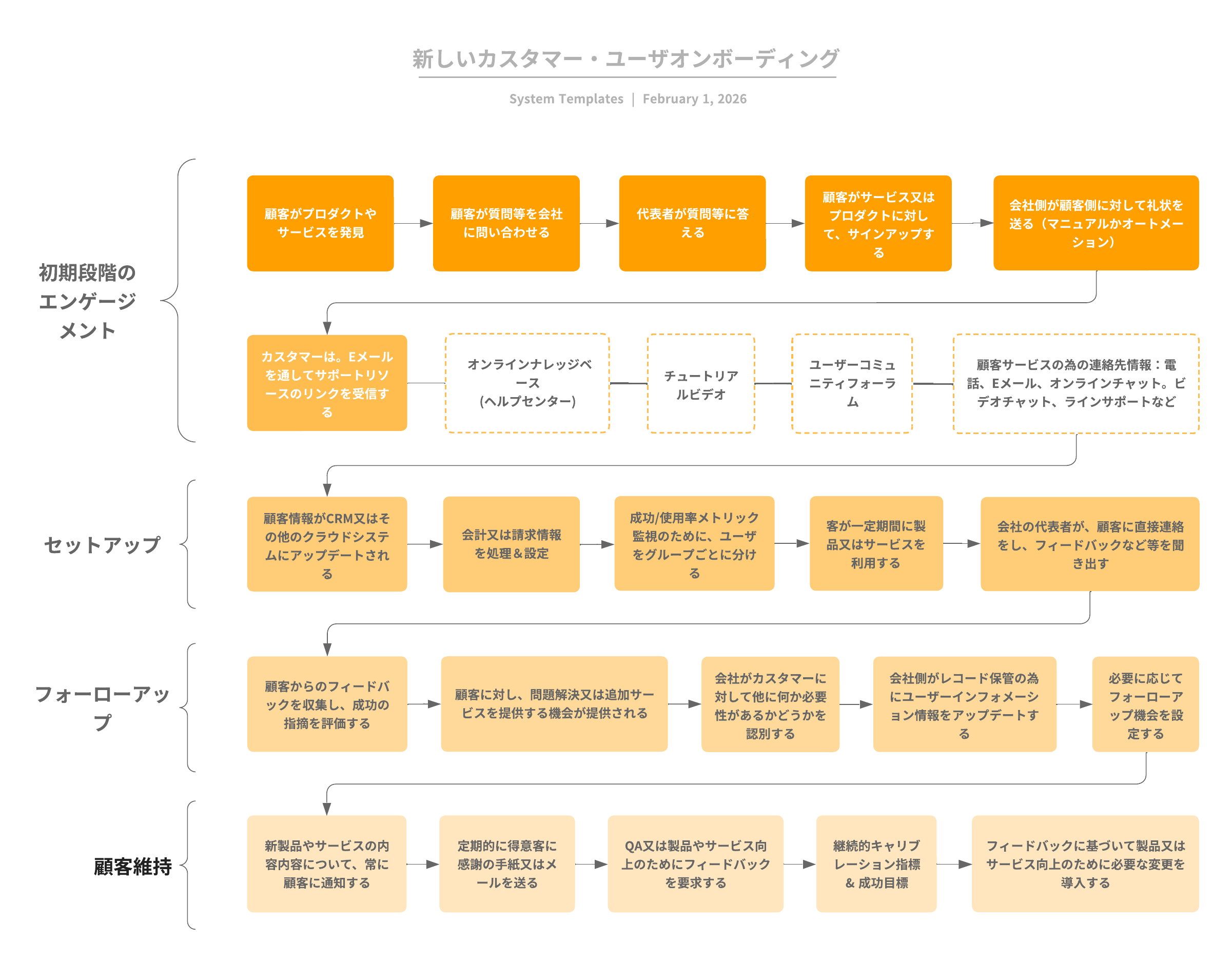 このフローチャートは、新しい顧客またはユーザーのオンボードの初期段階からユーザーの保持までの段階を示しています。