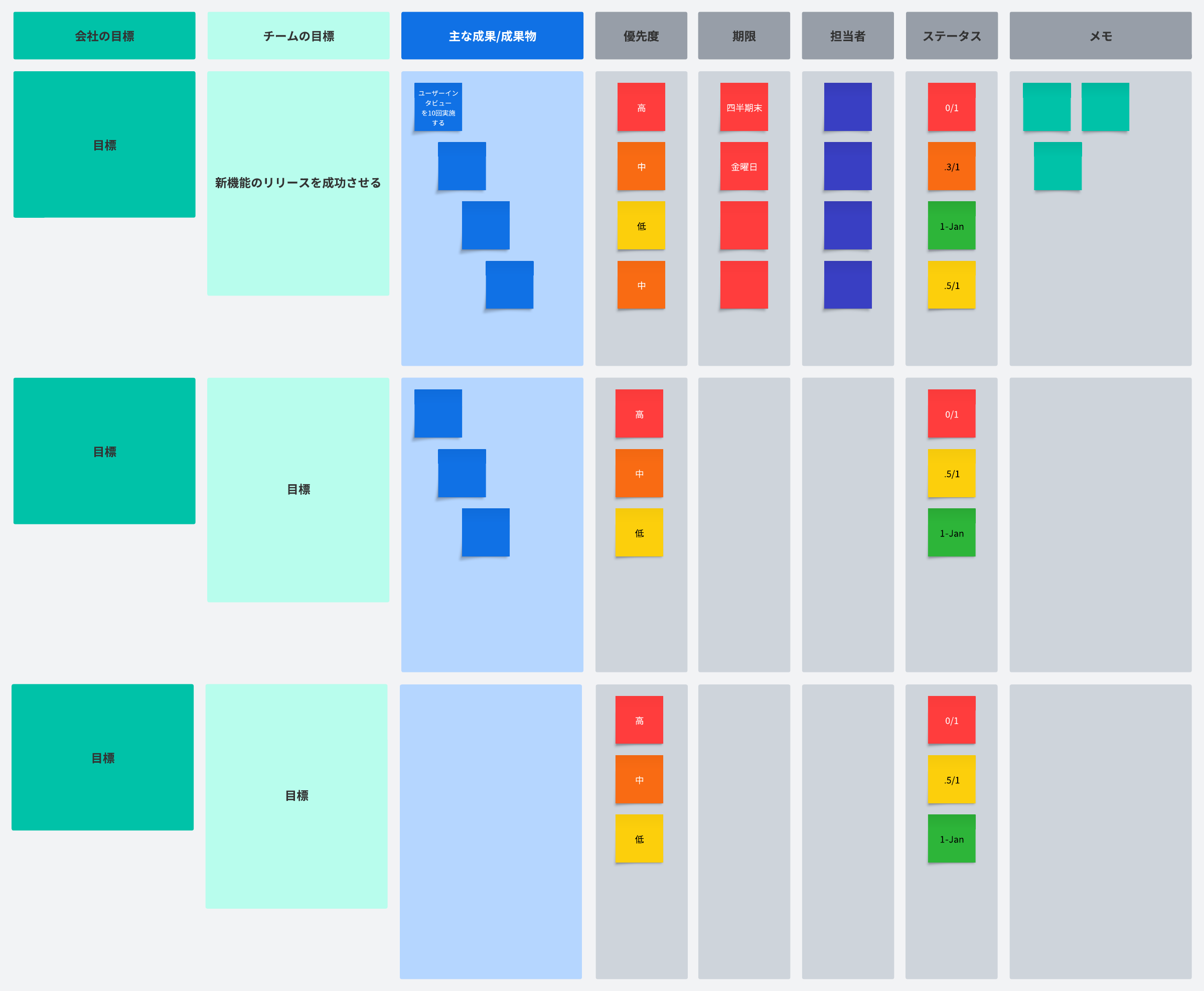 個人、チームや会社の目標設定に役立つ OKR (Objectives and Key Results - 目標と主な結果) テンプレートです。