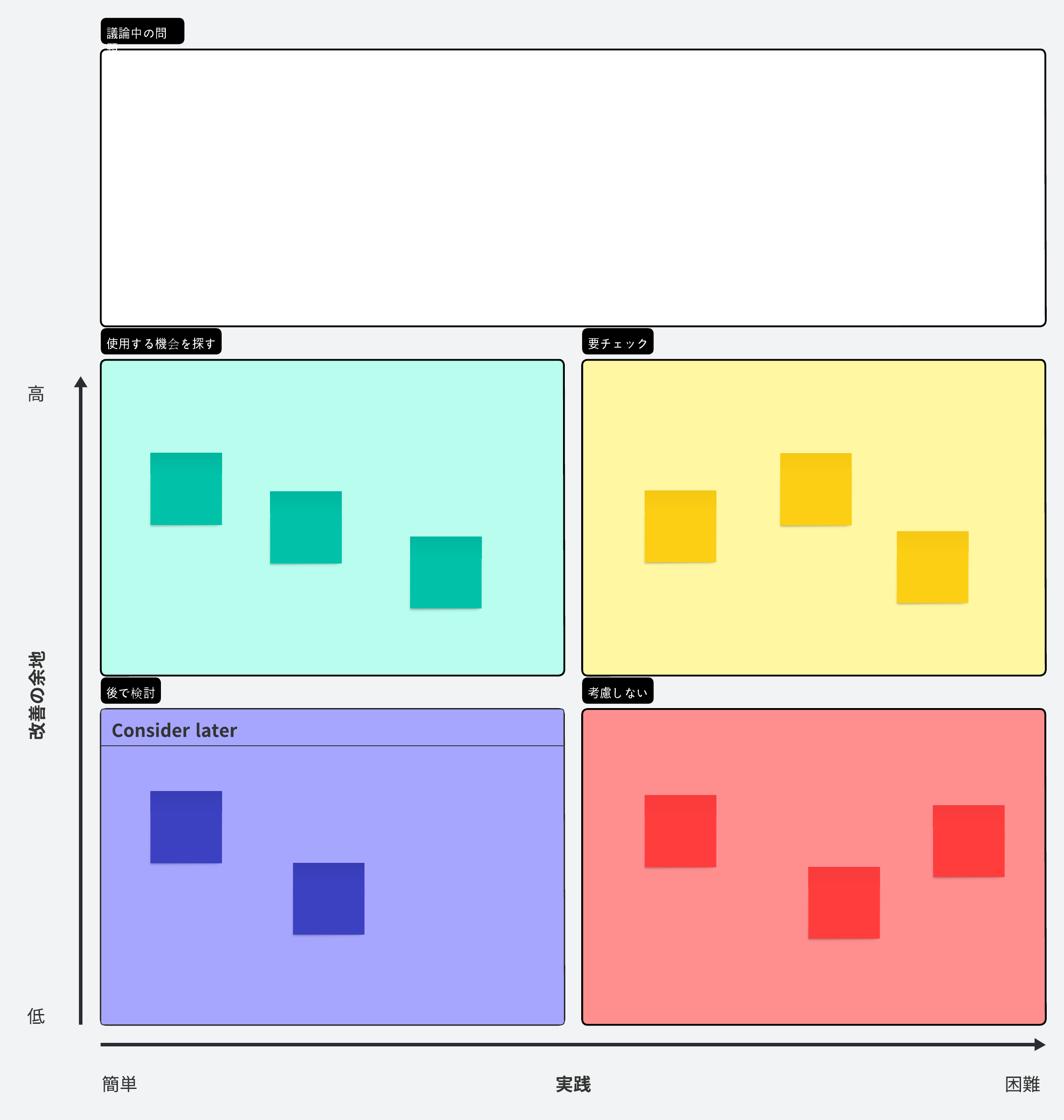 議題に集中して話し合いを進めるのに役立つパーキングロットマトリックスです。チームメンバーが、現在の議論には関係ないものの後で検討したいアイデア、コメントや質問を書き留めておけるスペースで、その他の象限は、改善と実践の可能性に基づいてアイデアを整理するために利用できます。