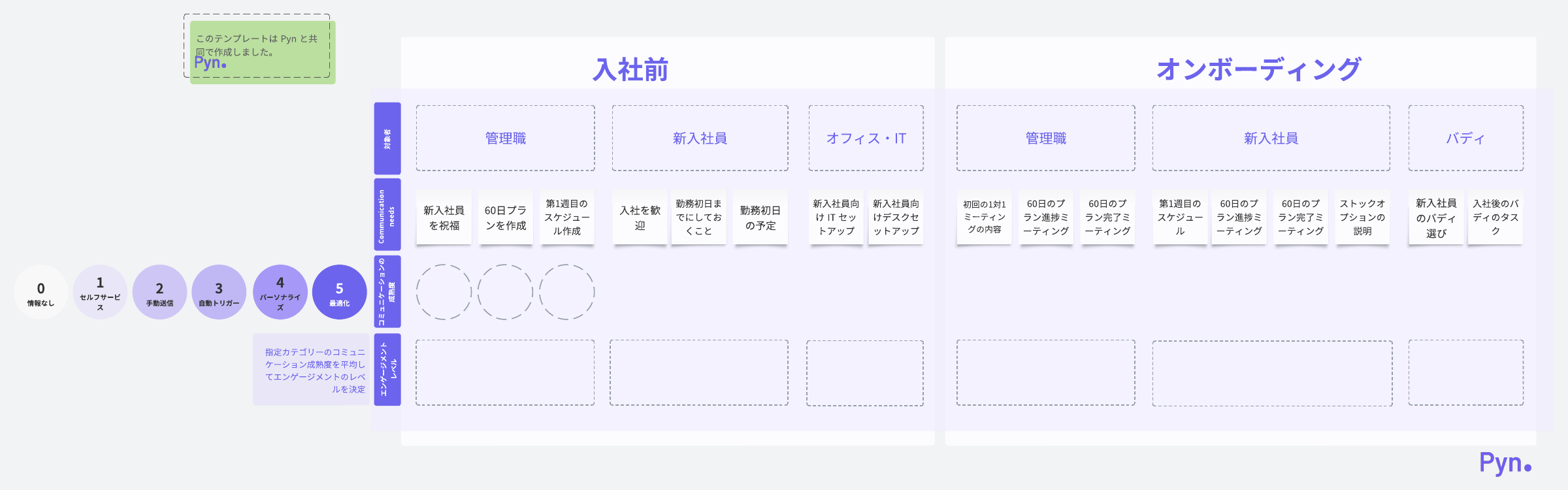 入社前から入社後の各社員のジャーニー分析に役立つ Pyn の従業員ジャーニーテンプレートです。