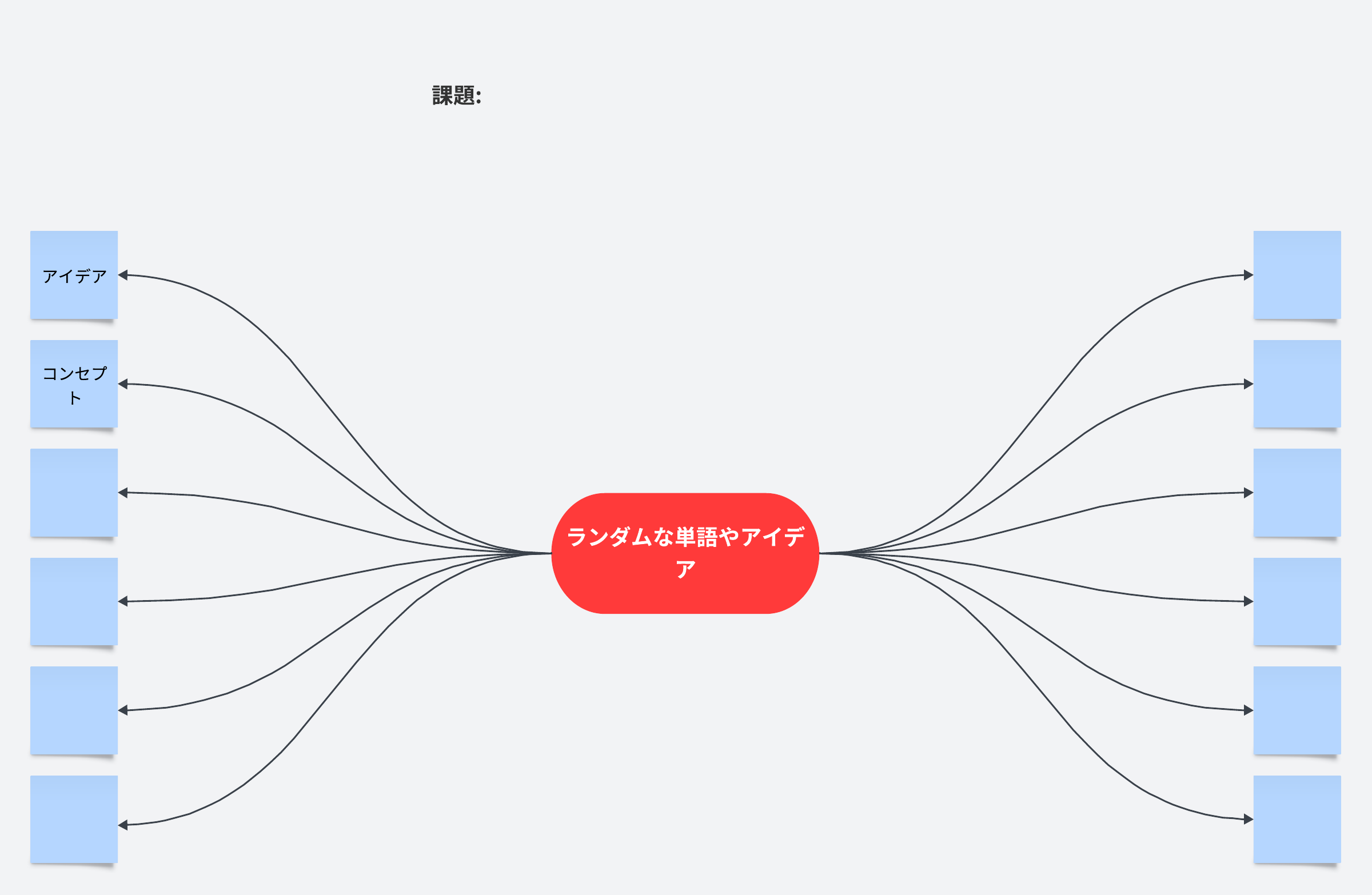 すばらしいアイデアは思いがけないところから生まれるもの。その原則に従ったテンプレートです。ランダムな単語から始めて、その単語や背後にある原則を現在取り組んでいる問題に適用してみましょう。違った角度から状況を眺めると、固定観念を崩し、新しいアイデアや解決策の発想につなげることができます。