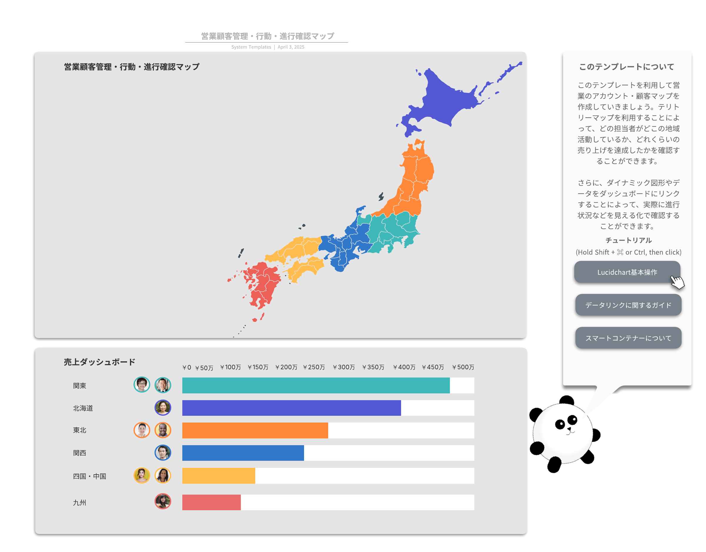このテンプレートを利用して営業のアカウント・顧客マップを作成していきましょう。テリトリーマップを利用することによって、どの担当者がどこの地域活動しているか、どれくらいの売り上げを達成したかを確認することができます。