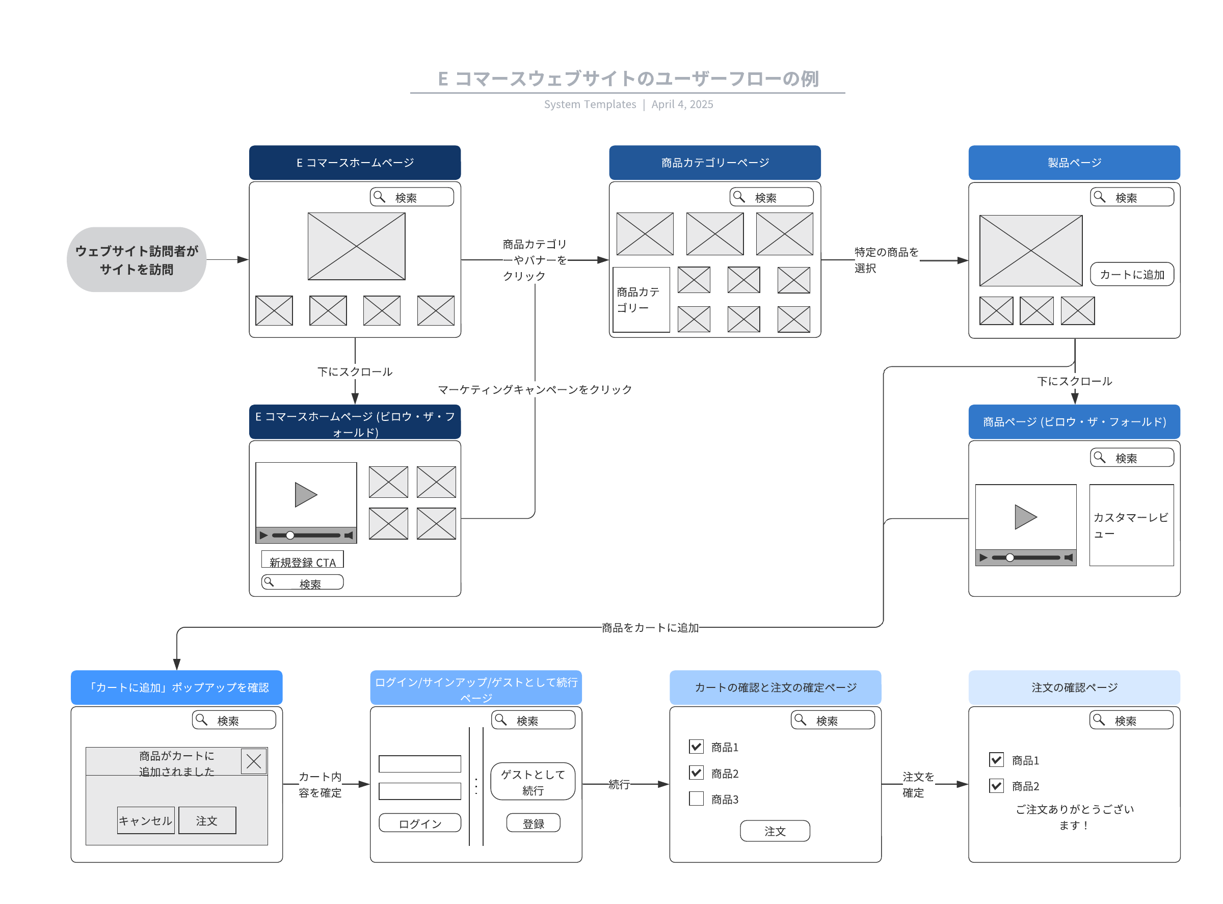 テンプレートを開き、ユースケースに合わせてカスタマイズ可能な E コマースウェブサイトのユーザーフローの例を詳しく確認してみましょう。