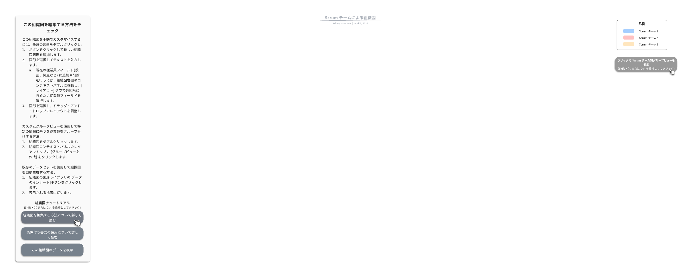 テンプレートを開き、ユースケースに合わせてカスタマイズ可能な Scrum チーム別の組織図の例を詳しく確認してみましょう。