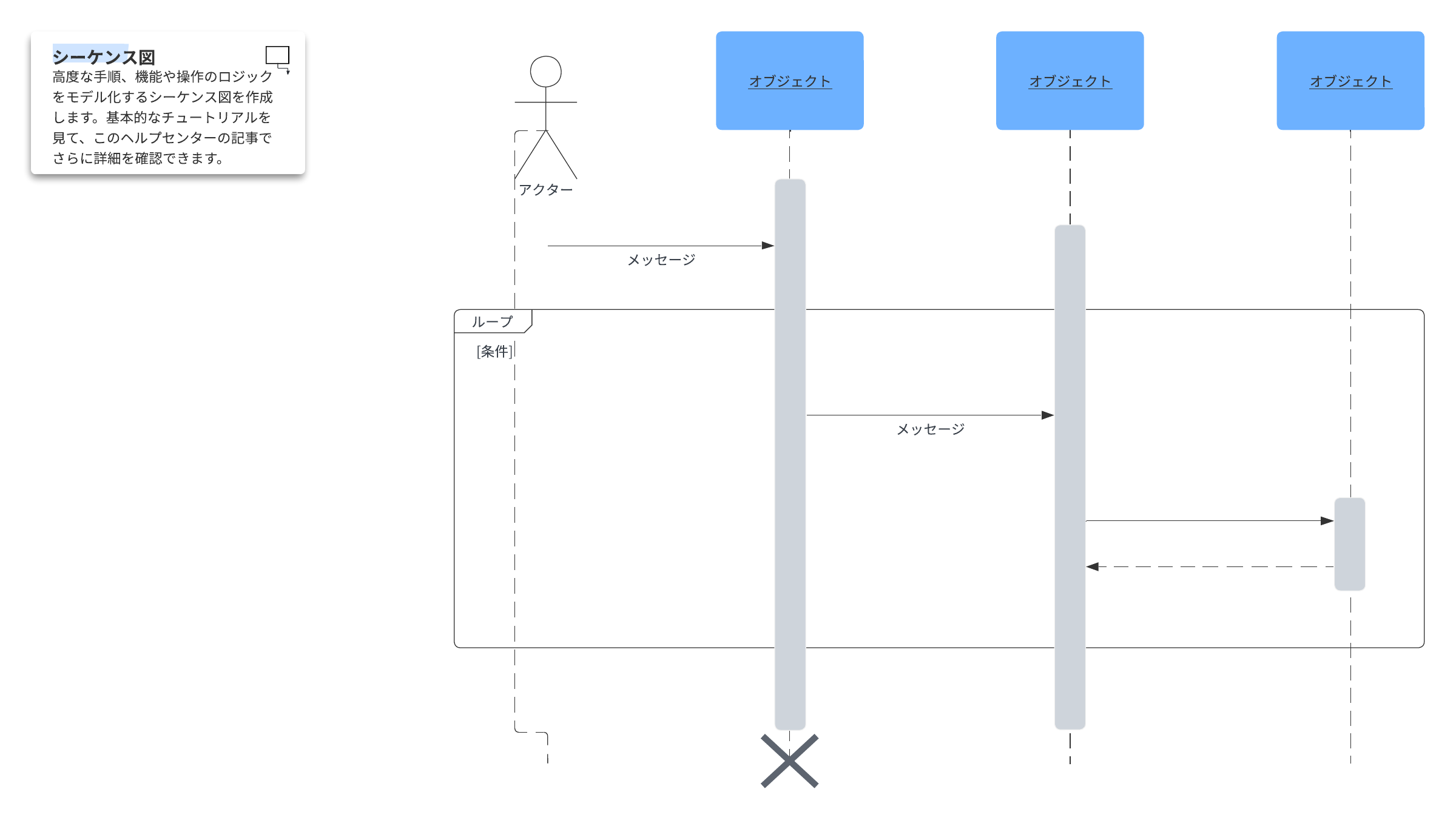 用途に合わせてシーケンス図をカスタマイズするには、このテンプレートを開き、コンテンツを追加します。