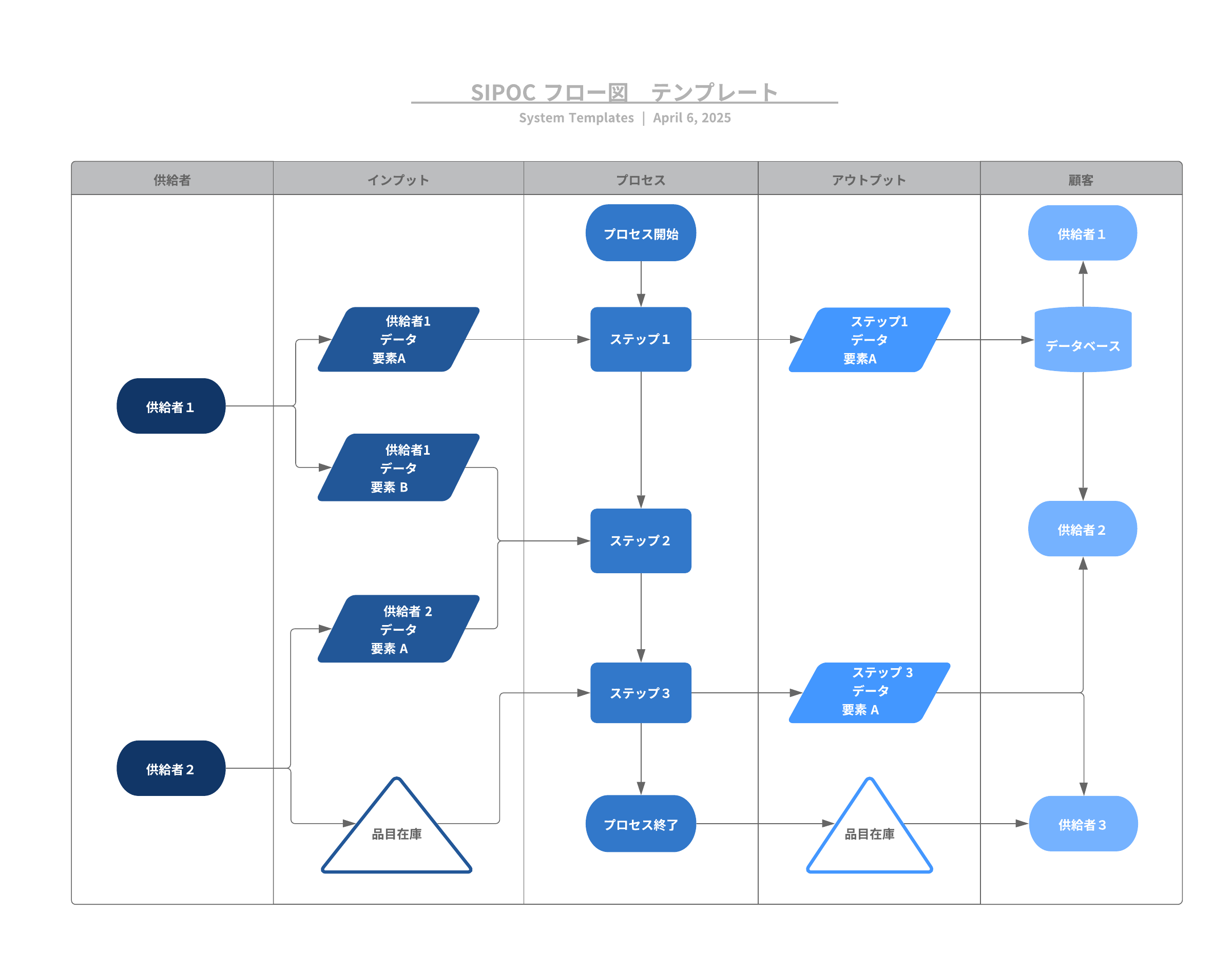 このテンプレートを開き、ユースケースに合わせてカスタマイズ可能な SIPOC 図の例を詳しく確認してみましょう。