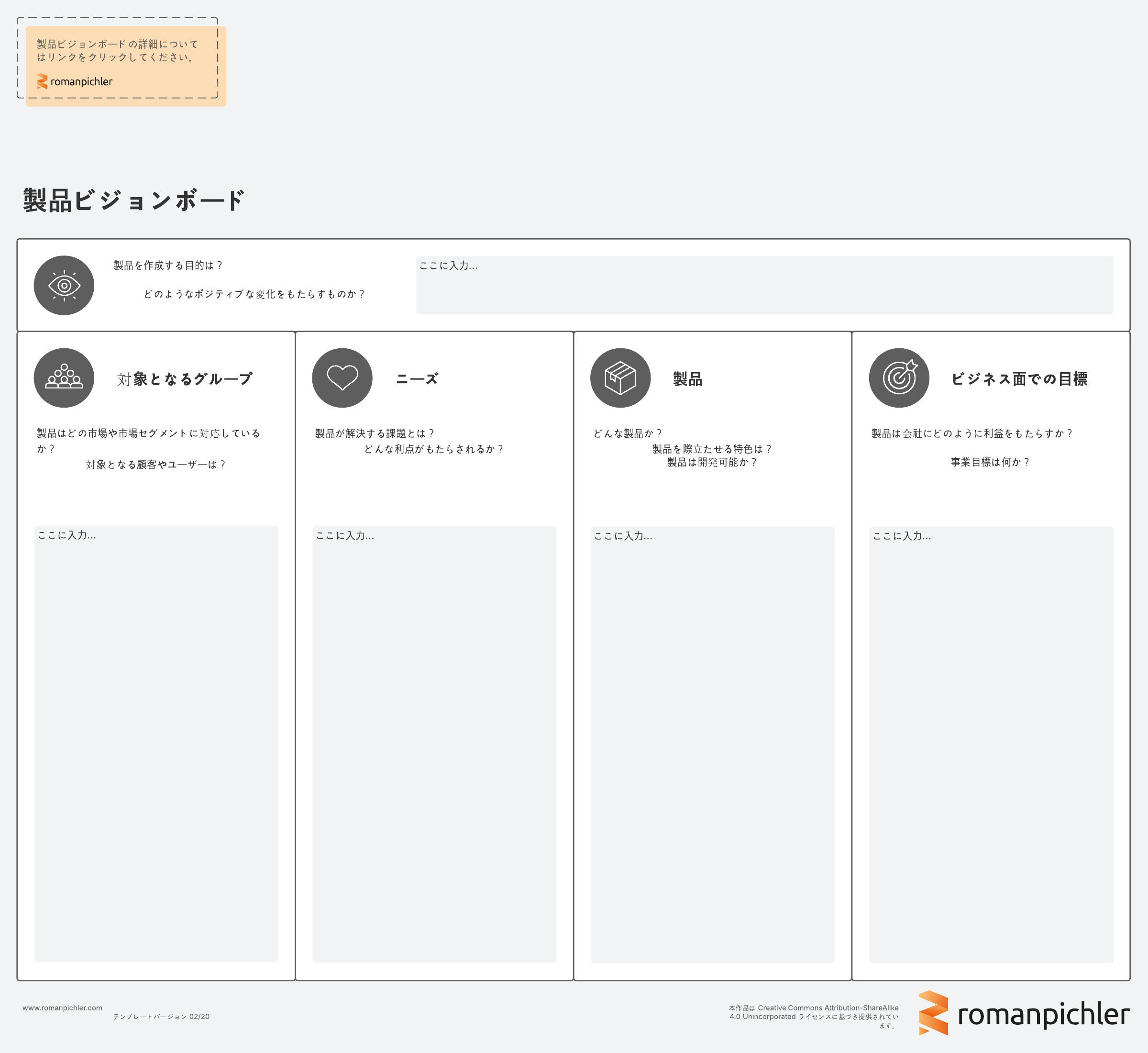 製品管理のエキスパートである Roman Pichler 発案の製品ビジョンボード テンプレートは、製品ビジョンと戦略の記述に役立ちます。対象グループ、ユーザーニーズ、製品機能や事業目標に関する重要な情報を一元的に捉えるのに最適です。