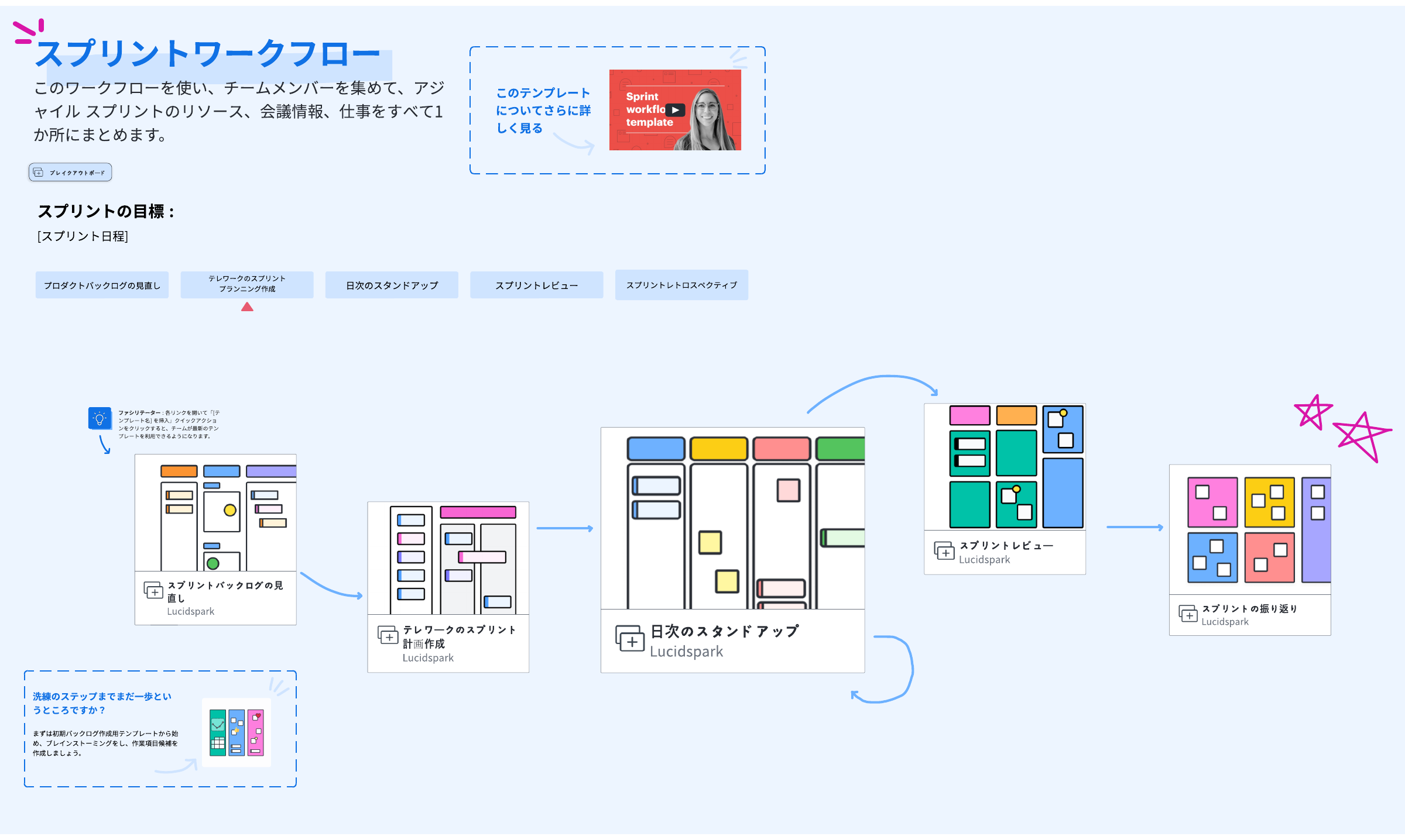 スプリントのすべてのアジャイルイベントを1か所にまとめて効率化できるテンプレートです。プロダクトバックログの絞り込み、スプリントの見積もり、スプリントプランニング、デイリースタンドアップ、スプリントレビュー、レトロスペクティブを全て1つのボードで対応できるように用意されています。