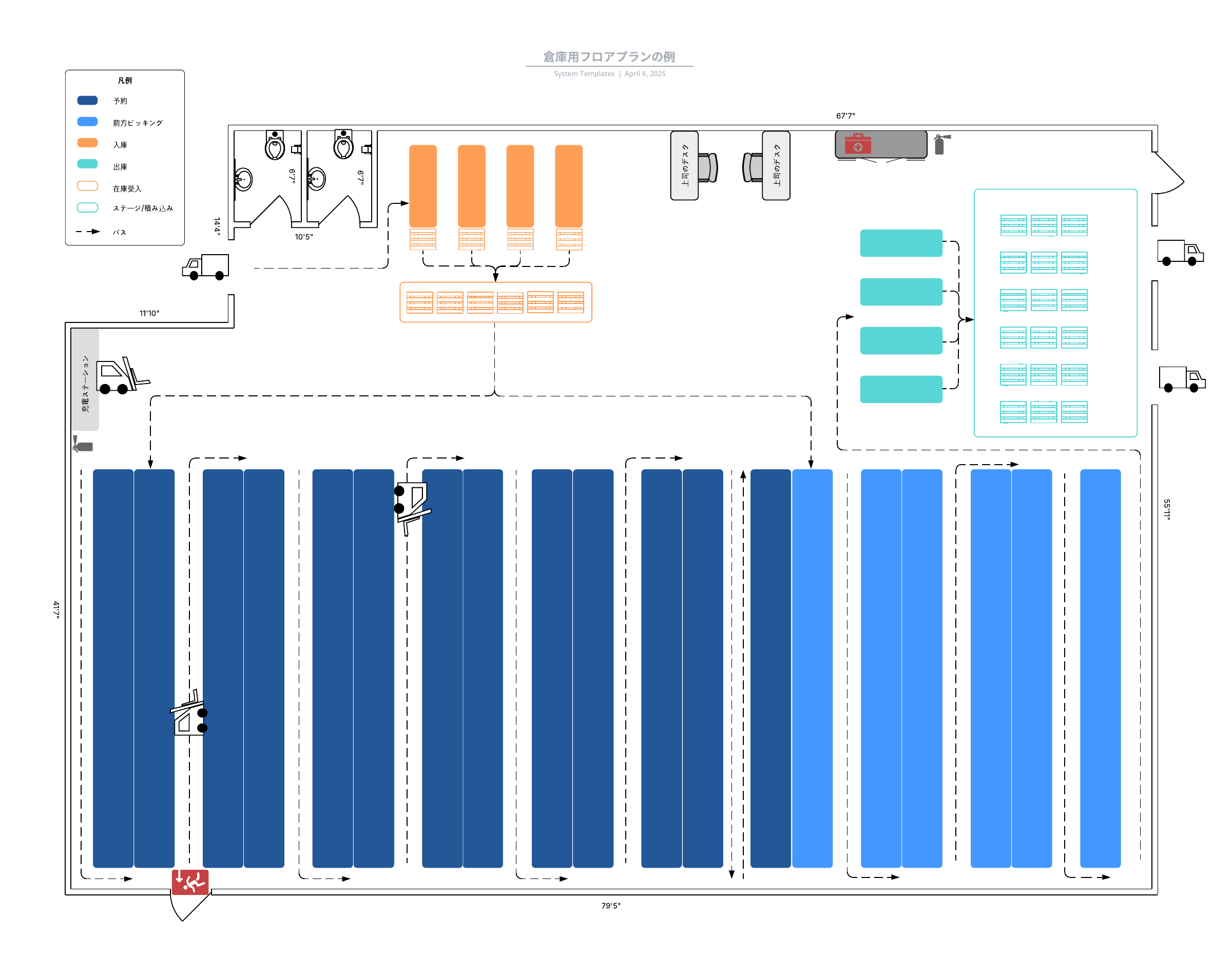 この倉庫フロアプランテンプレートは以下のような用途に役立ちます。