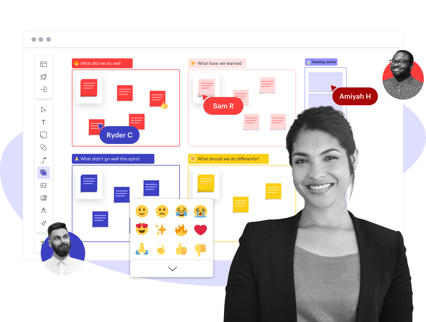 온라인 칸반 보드를 만들었다면 이제 아이디어를 실행으로 옮길 차례입니다. 브레이크아웃 보드, 협업자 색상 지정 등의 전략적 도구를 사용해 큰 그룹을 작은 그룹으로 나누고 아이디어를 간편하게 정리하세요. 보드에 아이디어를 정리한 후에는 투표, 타이머, 정렬 기능을 사용해 아이디어에 투표하고 진행 방향을 체계화할 수 있습니다.