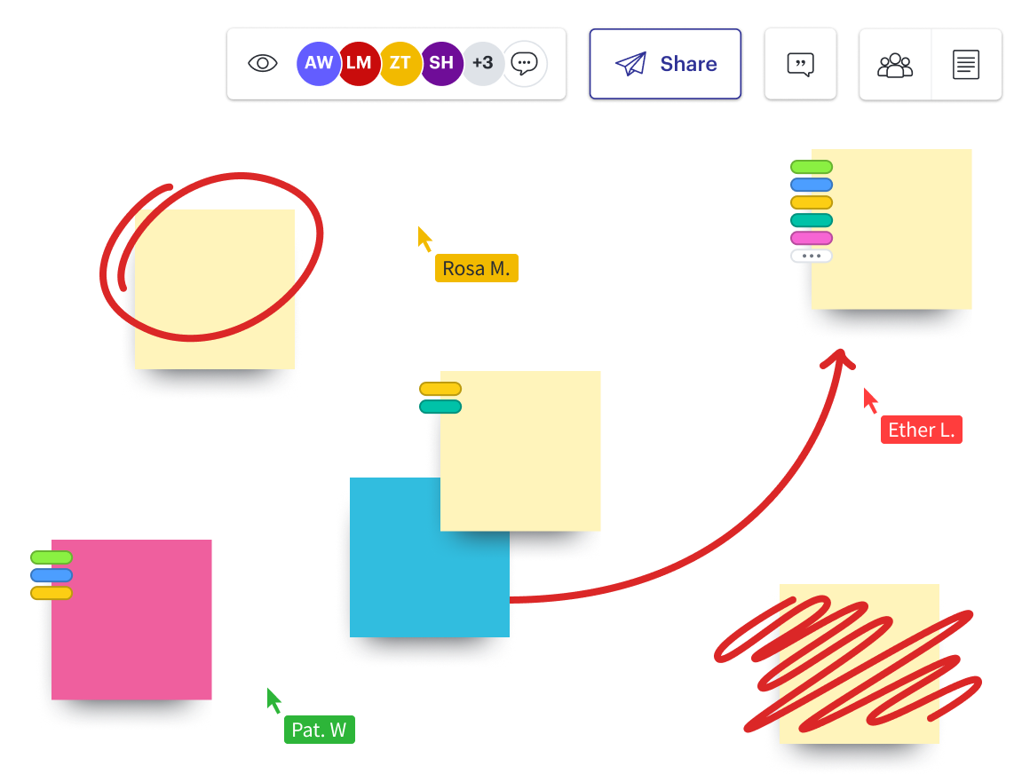 Lucidspark의 디지털 스티커 메모를 사용하면 모든 데 스크톱, 노트북과 모바일 기기에서 작동하는 무제한의 캔버스를 통해 편리하게 아이디어를 도출하고 공유할 수 있습니다.
