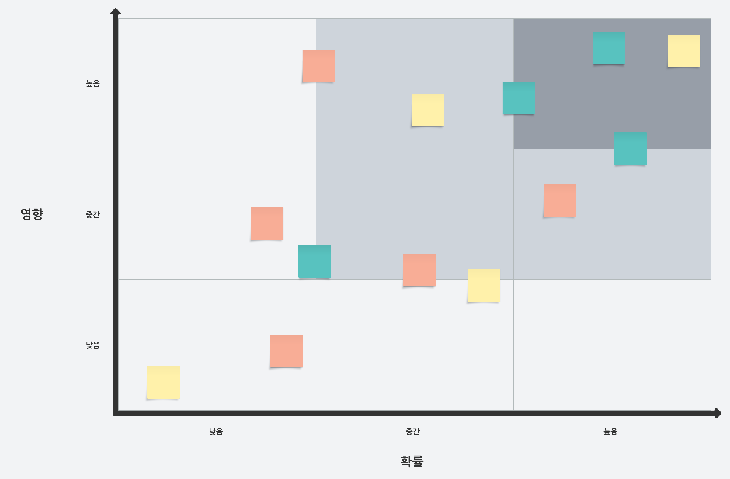 영향과 확률에 따라 행동이나 아이디어의 우선순위를 정하세요. 각 축은 낮음, 중간, 높음으로 구분되어 기존의 2x2 매트릭스 이상의 체계를 제공합니다.
