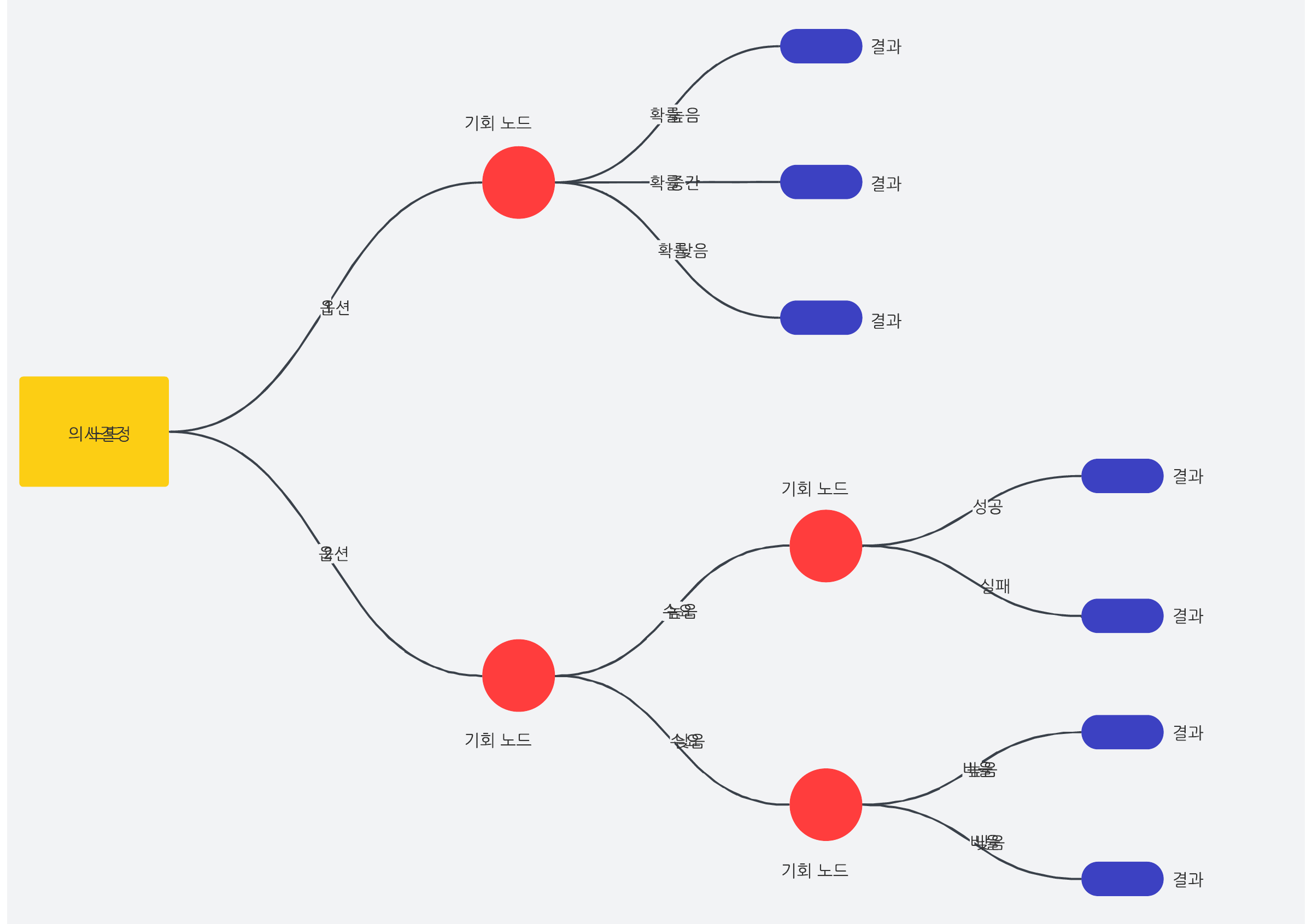 왼쪽에서 오른쪽으로 배치된 의사결정나무는 다이어그램의 '몸통'에 있는 의사 결정 노드에서 시작해 기회 노드로 갈라지고, '잎'을 잠재적 결과나 최종 노드로 사용합니다. 각각의 가지는 결과 확률, 성패, 기타 변수를 포함한 다양한 정보를 나타냅니다. 차트의 선 하나하나를 따라가면 잠재적 결과의 확률과 최종 결과를 한눈에 볼 수 있습니다.