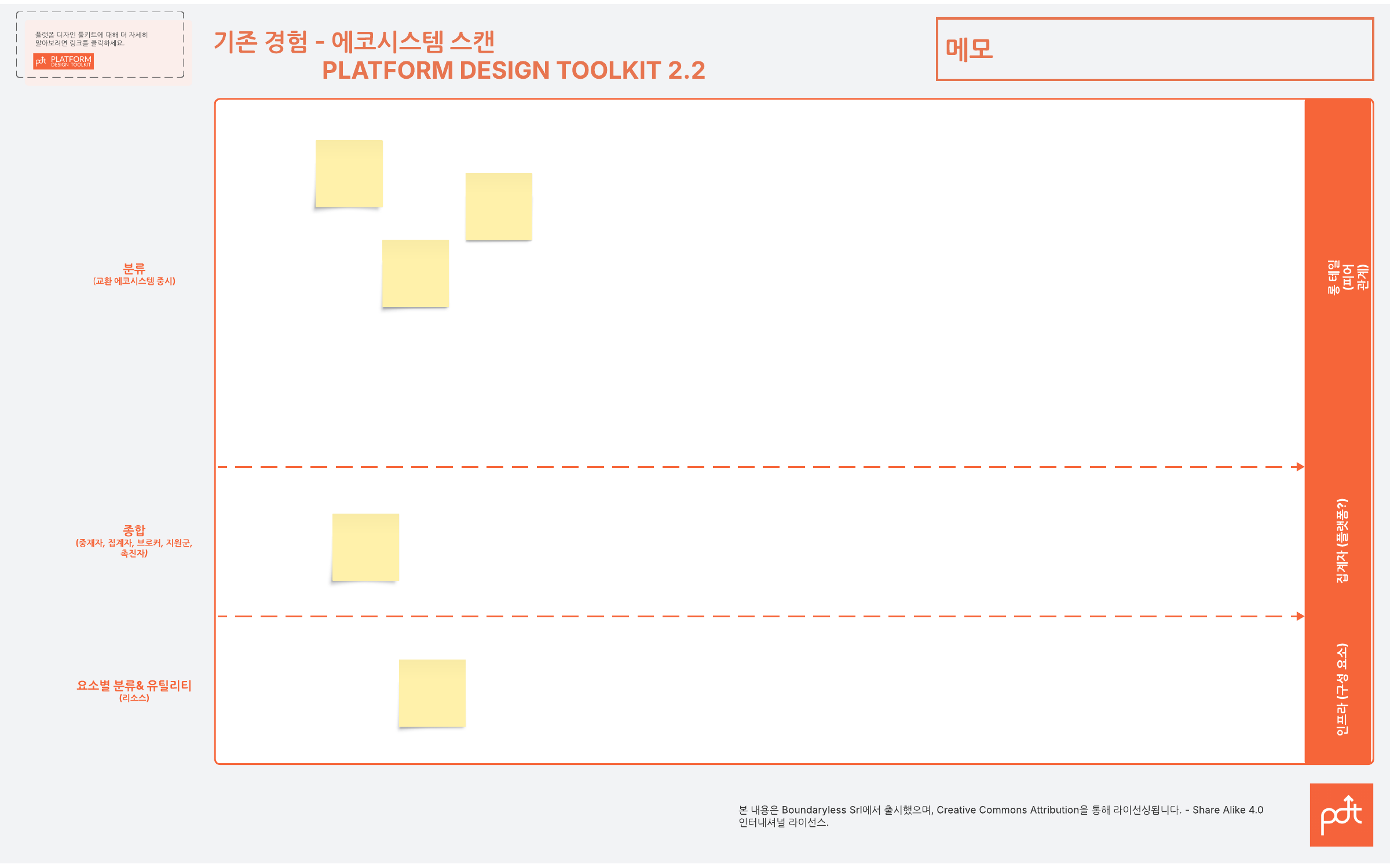 에코시스템 스캔은 팀 간 의견을 합치시키고, 에코시스템 시그널을 시각화하는 데 도움이 됩니다. 에코시스템 구성 요소, 객체, 요소를 레이어된 시장 추상(롱 테일 시장, 집계 요소, 인프라)으로 맵핑하세요.